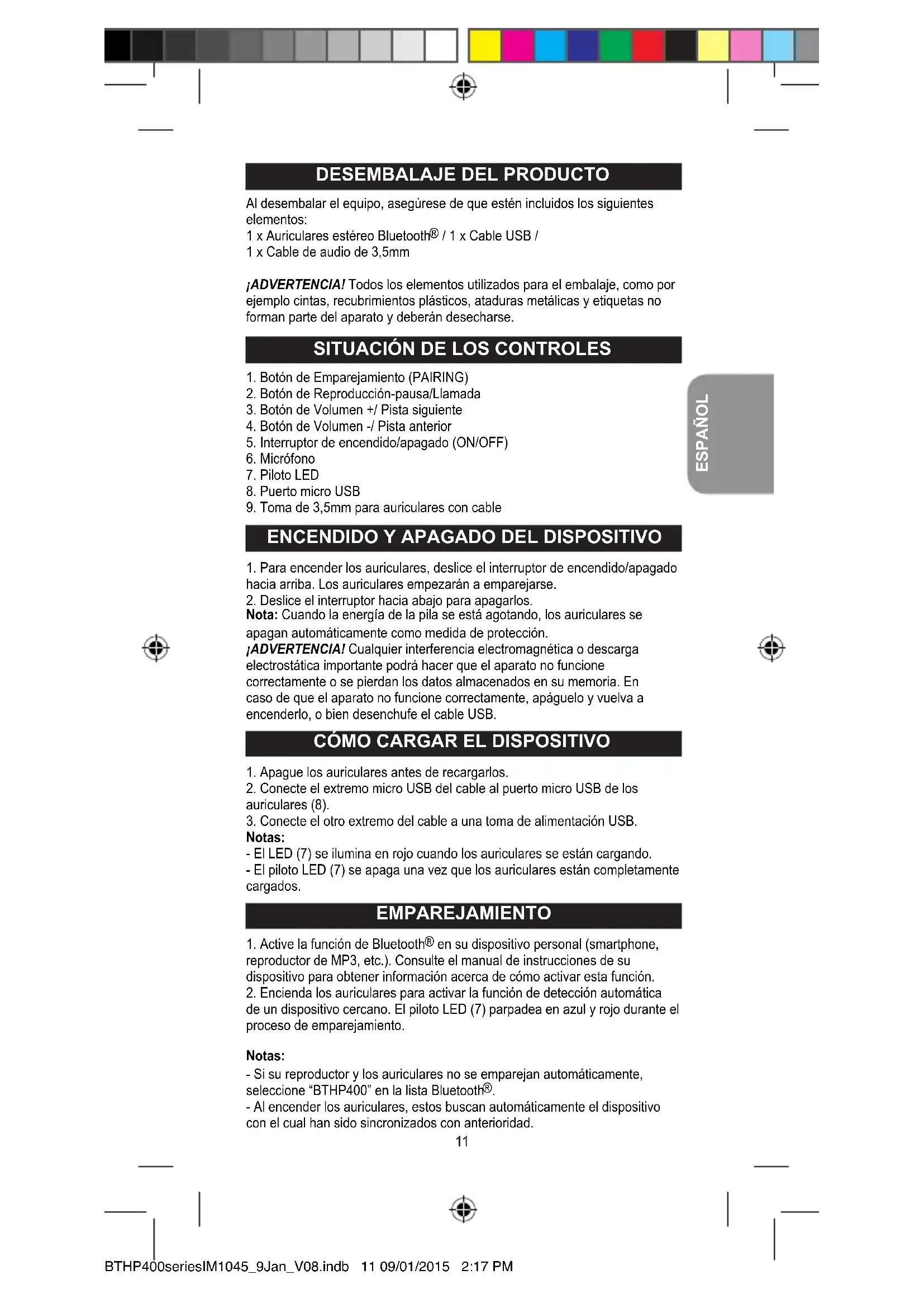 de un dispositivo cercano. El piloto LED (7) parpadea en azul y rojo durante el proceso de emparejamiento. Notas: - Si su reproductor y los auriculares no se emparejan automáticamente, seleccione “BTHP400” en la lista Bluetooth