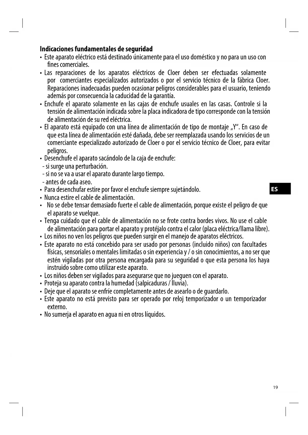 - El aparato está equipado con una linea de alimentación de tipo de montaje „Y". En caso de que esta linea de alimentación está dañada, debe ser reemplazada usingo los servicios de un commerciente especializzato autorizzato de Cloer o por el service technique of Cloer, para evitar peligros.