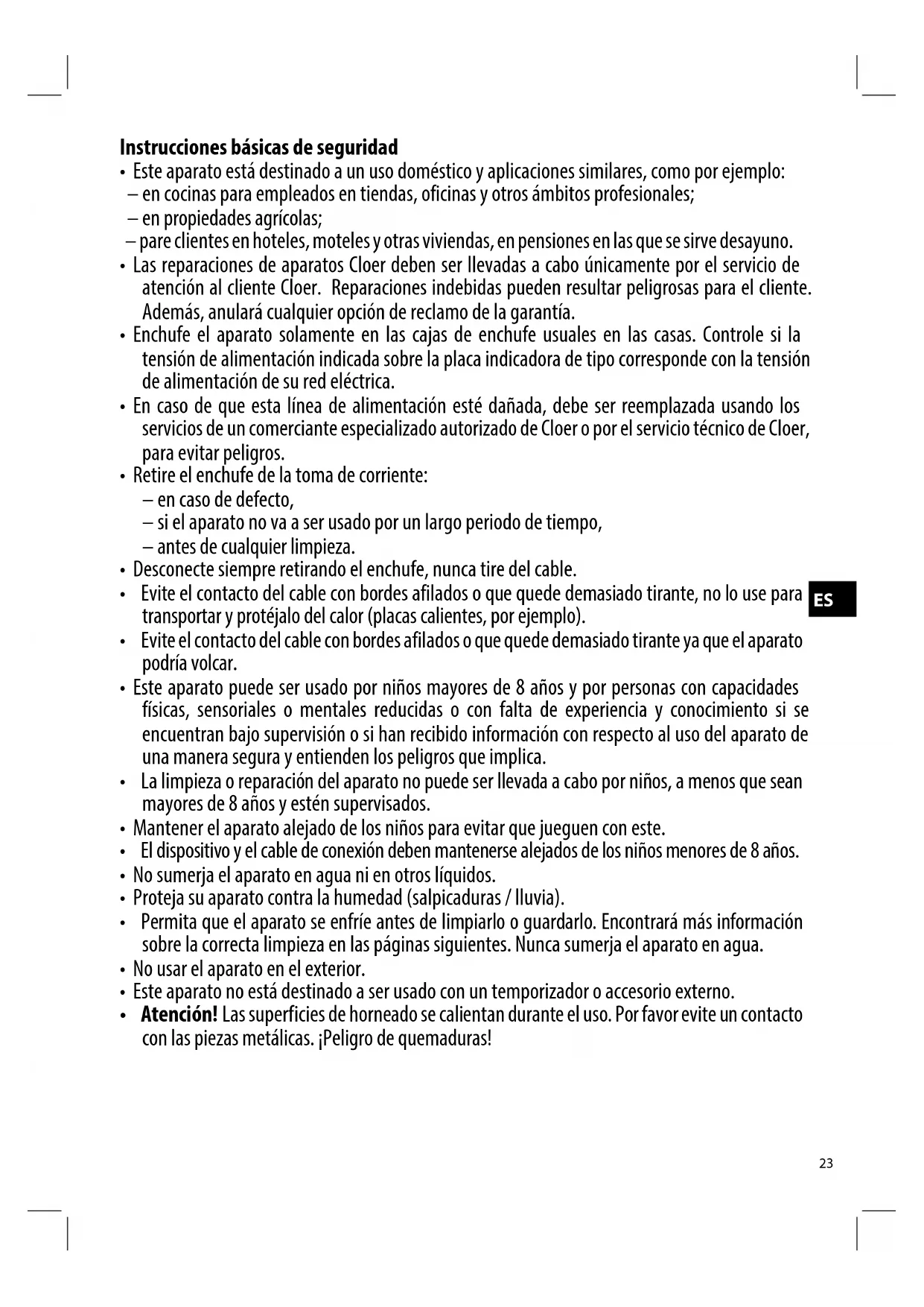 Las reparaciones de aparatos Cloer deben ser llavadas a cabo unicamente por el service de atencion al cliente Cloer. Reparaciones indebidasuened resultar peligrosas para el cliente. Además, anularáequalquieropiónde reclamo de la garantía.