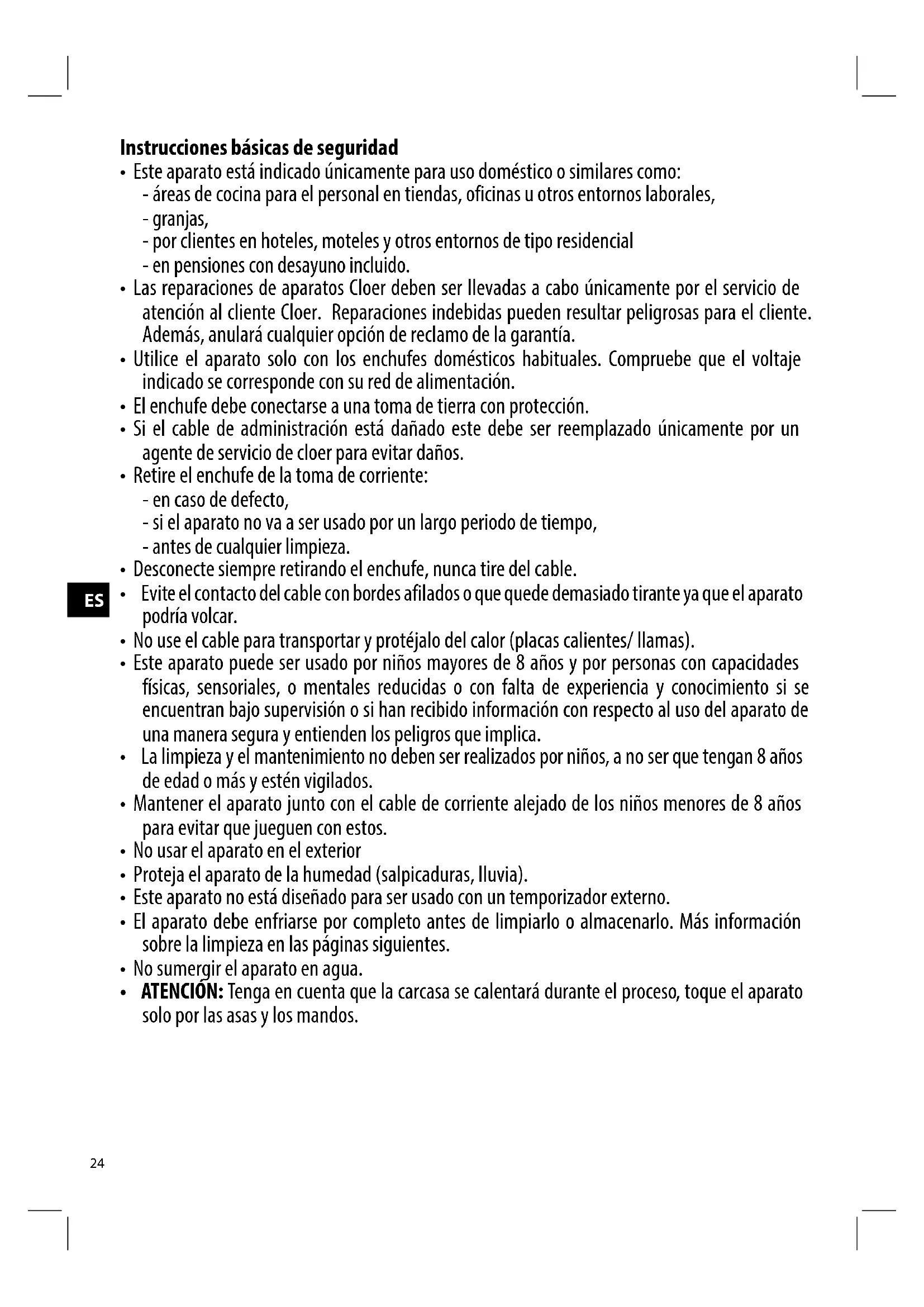 - Las reparaciones de aparatos Cloer deben ser llevadas a cabo únicamente por el servicio de atención al cliente Cloer. Reparaciones indebidas pueden resultar peligrosas para el cliente. Además, anulará cualquier opción de reclamo de la garantía.