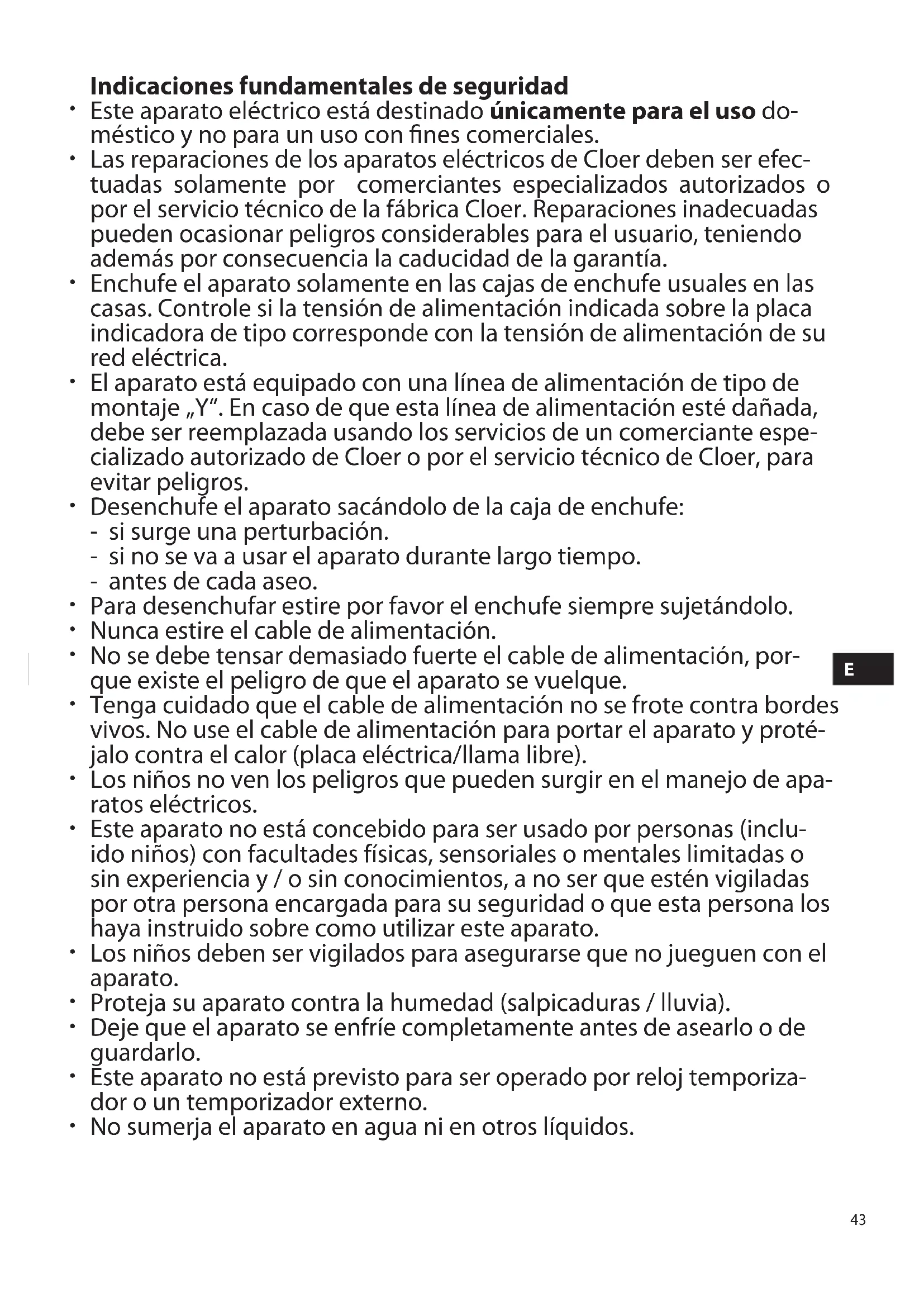 I43 Indicaciones fundamentales de seguridad Este aparato eléctrico está destinado únicamente para el uso do- méstico y no para un uso con nes comerciales. Las reparaciones de los aparatos eléctricos de Cloer deben ser efec- tuadas solamente por comerciantes especializados autorizados o por el servicio técnico de la fábrica Cloer. Reparaciones inadecuadas pueden ocasionar peligros considerables para el usuario, teniendo además por consecuencia la caducidad de la garantía. Enchufe el aparato solamente en las cajas de enchufe usuales en las casas. Controle si la tensión de alimentación indicada sobre la placa indicadora de tipo corresponde con la tensión de alimentación de su red eléctrica. El aparato está equipado con una línea de alimentación de tipo de montaje „Y“. En caso de que esta línea de alimentación esté dañada, debe ser reemplazada usando los servicios de un comerciante espe- cializado autorizado de Cloer o por el servicio técnico de Cloer, para evitar peligros. Desenchufe el aparato sacándolo de la caja de enchufe: - si surge una perturbación. - si no se va a usar el aparato durante largo tiempo. - antes de cada aseo. Para desenchufar estire por favor el enchufe siempre sujetándolo. Nunca estire el cable de alimentación. No se debe tensar demasiado fuerte el cable de alimentación, por- que existe el peligro de que el aparato se vuelque. Tenga cuidado que el cable de alimentación no se frote contra bordes vivos. No use el cable de alimentación para portar el aparato y proté- jalo contra el calor (placa eléctrica/llama libre). Los niños no ven los peligros que pueden surgir en el manejo de apa- ratos eléctricos. Este aparato no está concebido para ser usado por personas (inclu- ido niños) con facultades físicas, sensoriales o mentales limitadas o sin experiencia y / o sin conocimientos, a no ser que estén vigiladas por otra persona encargada para su seguridad o que esta persona los haya instruido sobre como utilizar este aparato. Los niños deben ser vigilados para asegurarse que no jueguen con el aparato. Proteja su aparato contra la humedad (salpicaduras / lluvia). Deje que el aparato se enfríe completamente antes de asearlo o de guardarlo. Este aparato no está previsto para ser operado por reloj temporiza- dor o un temporizador externo. No sumerja el aparato en agua ni en otros líquidos.