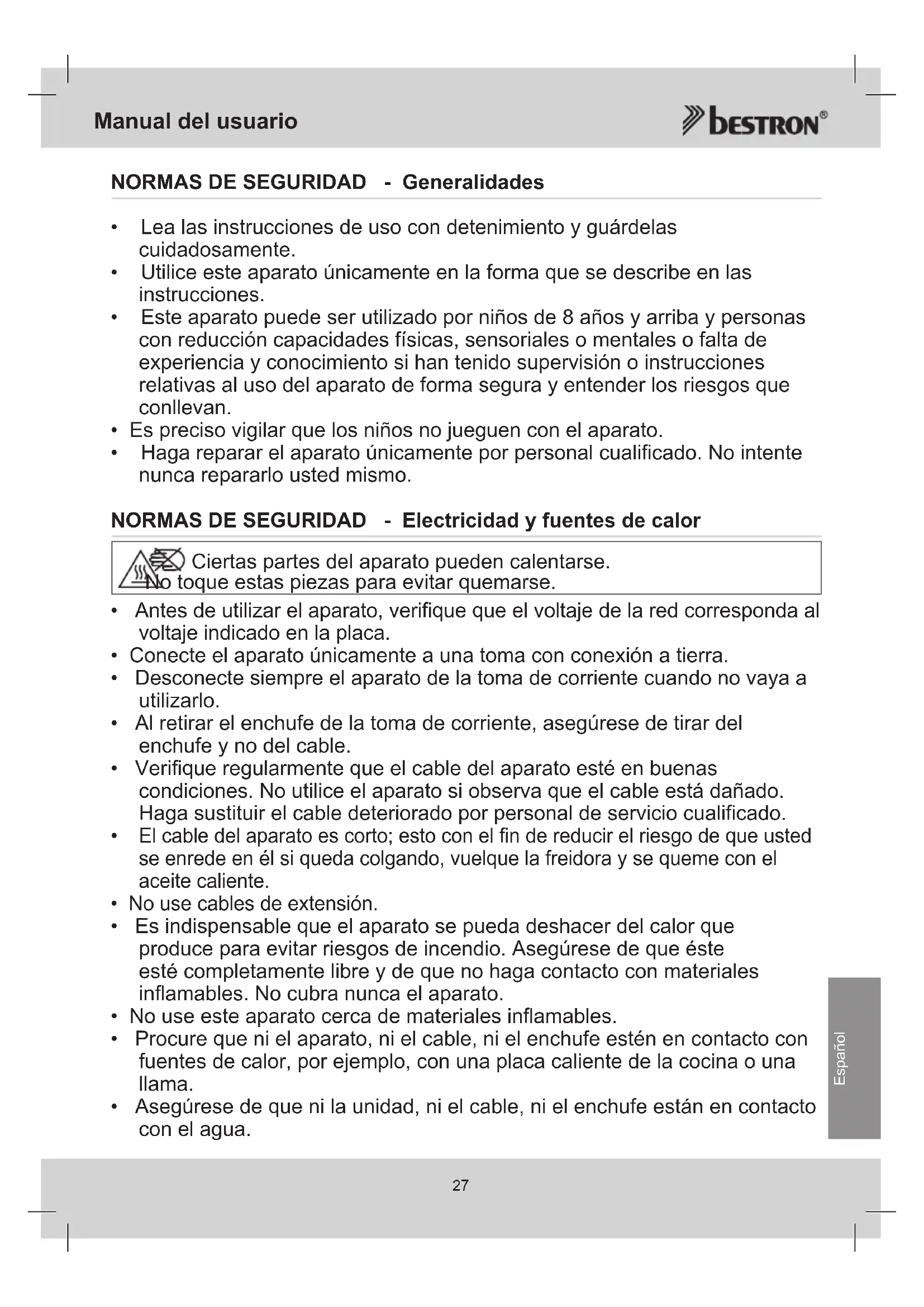 SERVICIO Si se presenta un fallo inesperado, puede ponerse en contacto con el departamento de servicios de BESTRON: www.bestron.com/service CERTIFICACIÓN DE CONFORMIDAD (CE) Este producto satisface las disposiciones de las siguientes directivas de la Unión Europea en el marco de la seguridad:
