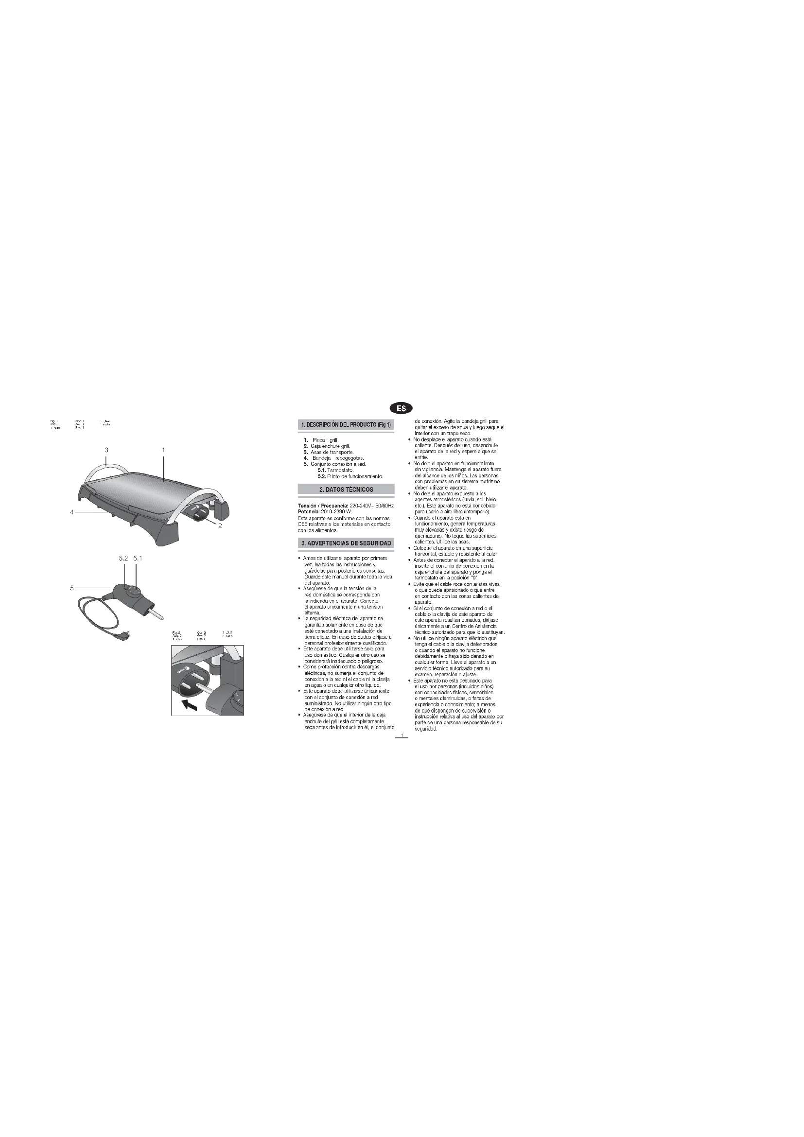 Tensión / Frecuencia: 220-240V~ 50/60Hz Potencia: 2010-2390 W. Este aparato es conforme con las normas CEE relativas a los materiales en contacto con los alimentos. Fig. 1 Abb. 1 1. Ábra Obr. 1 Фиг. 1 Рис. 1 1 irudiaFig. 2 Abb. 2 2. Ábra Obr. 2 Фиг. 2 Рис. 2 2 irudia