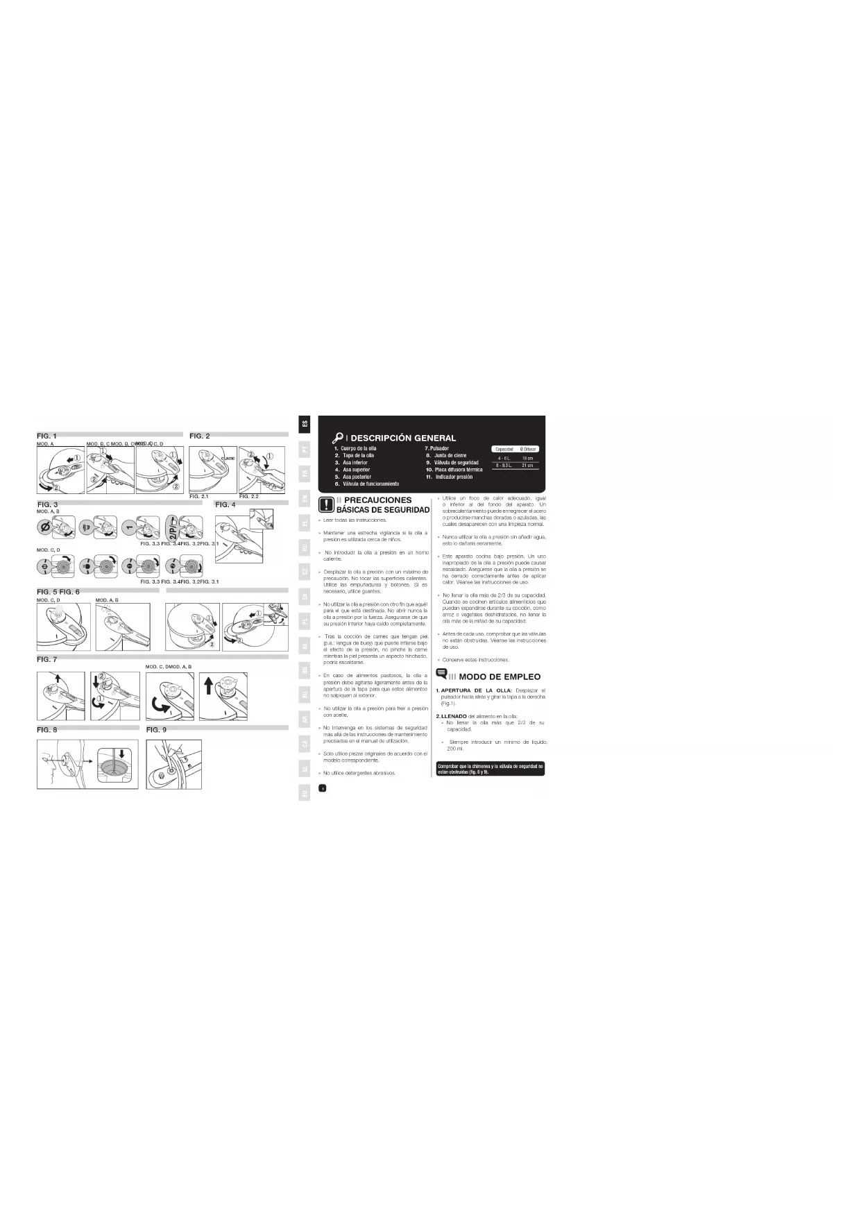 » No llenar la olla más que 2/3 de su capacidad. » Siempre introducir un mínimo de líquido, 200 ml. Comprobar que la chimenea y la válvula de seguridad no están obstruidas (fi g. 8 y 9). » Leer todas las instrucciones. » Mantener una estrecha vigilancia si la olla a presión es utilizada cerca de niños. » No introducir la olla a presión en un horno caliente. » Desplazar la olla a presión con un máximo de precaución. No tocar las superfi cies calientes. Utilice las empuñaduras y botones. Si es necesario, utilice guantes. » No utilizar la olla a presión con otro fi n que aquél para el que está destinada. No abrir nunca la olla a presión por la fuerza. Asegurarse de que su presión interior haya caído completamente. » Tras la cocción de carnes que tengan piel, (p.e.: lengua de buey) que puede infl arse bajo el efecto de la presión, no pinche la carne mientras la piel presenta un aspecto hinchado, podría escaldarse. » En caso de alimentos pastosos, la olla a presión debe agitarse ligeramente antes de la apertura de la tapa para que estos alimentos no salpiquen al exterior. » No utilizar la olla a presión para freír a presión con aceite. » No intervenga en los sistemas de seguridad más allá de las instrucciones de mantenimiento precisadas en el manual de utilización. » Solo utilice piezas originales de acuerdo con el modelo correspondiente. » No utilice detergentes abrasivos. II PRECAUCIONES