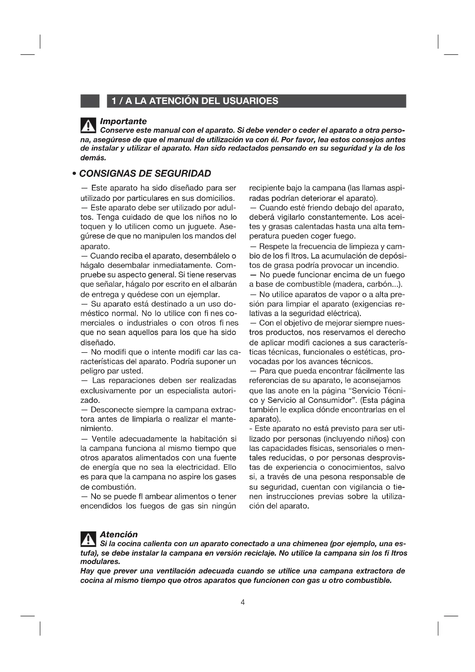 Importante Conserve este manual con el aparato. Si debe vender o ceder el aparato a otra perso- na, asegúrese de que el manual de utilización va con él. Por favor, lea estos consejos antes de instalar y utilizar el aparato. Han sido redactados pensando en su seguridad y la de los demás. Atención Si la cocina calienta con un aparato conectado a una chimenea (por ejemplo, una es- tufa), se debe instalar la campana en versión reciclaje. No utilice la campana sin los fi ltros modulares. Hay que prever una ventilación adecuada cuando se utilice una campana extractora de cocina al mismo tiempo que otros aparatos que funcionen con gas u otro combustible.