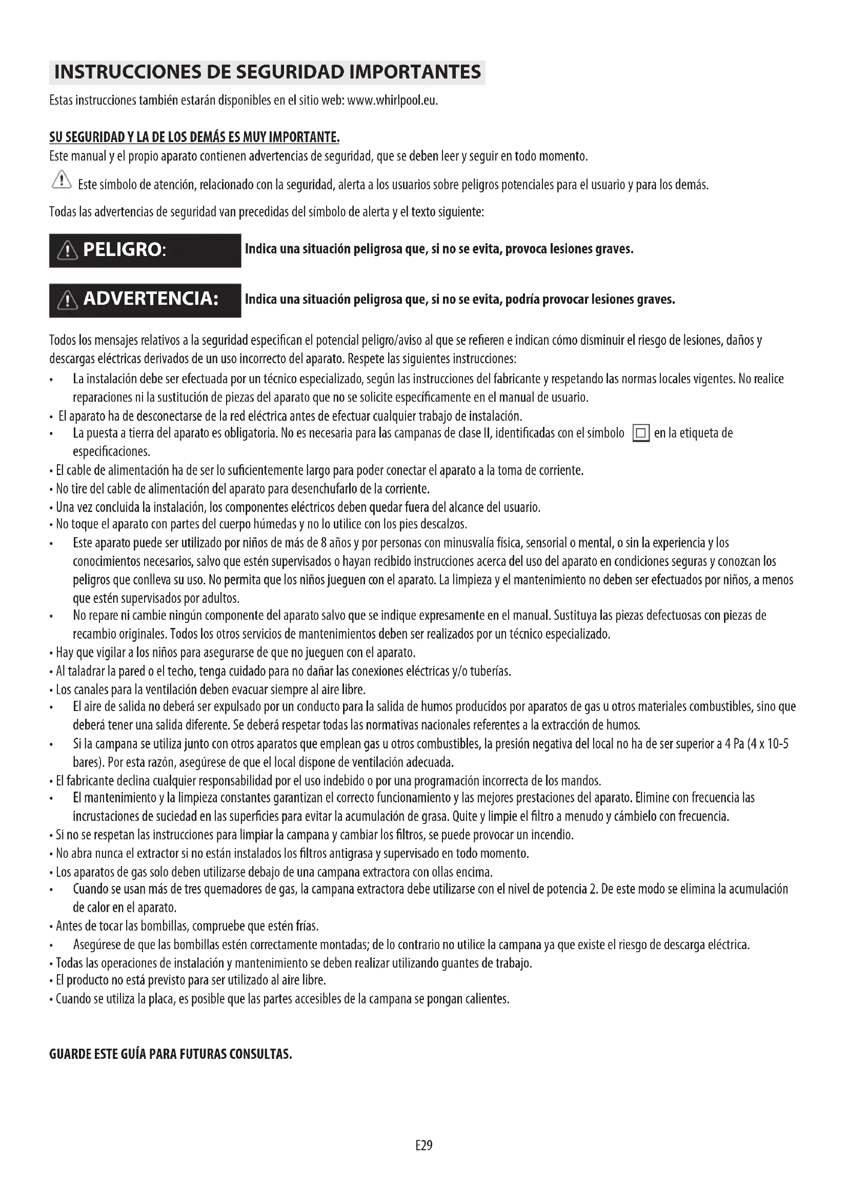- Cuando se utiliza la placa, es posible que las partes accesibles de la campana se pongan calientes. GUARDE ESTE GUÍA PARA FUTURAS CONSULTAS. ADVERTENCIA: PELIGRO:E30 Tras desembalar, compruebe si se ha dañado el aparato durante el transporte. Si hubiera problemas, póngase en contacto con el comerciante o el Servicio de Asistencia Técnica. Para evitar daños, extraiga el aparato de su embalaje solo en el momento de la instalación.