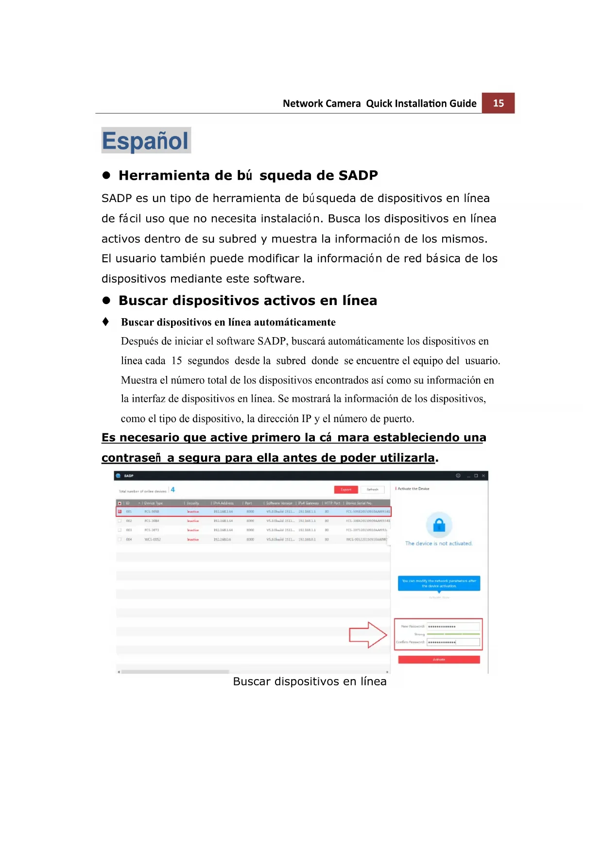 Español Herramienta de bú squeda de SADP SADP es un tipo de herramienta de búsqueda de dispositivos en línea de fácil uso que no necesita instalación. Busca los dispositivos en línea activos dentro de su subred y muestra la información de los mismos. El usuario también puede modificar la información de red básica de los dispositivos mediante este software. Buscar dispositivos activos en línea Buscar dispositivos en línea automáticamente Después de iniciar el software SADP, buscará automáticamente los dispositivos en línea cada 15 segundos desde la subred donde se encuentre el equipo del usuario. Muestra el número total de los dispositivos encontrados así como su información en la interfaz de dispositivos en línea. Se mostrará la información de los dispositivos, como el tipo de dispositivo, la dirección IP y el número de puerto. Es necesario que active primero la cá mara estableciendo una contraseñ a segura para ella antes de poder utilizarla. Buscar dispositivos en línea16 Network Camera Quick Installation Guide