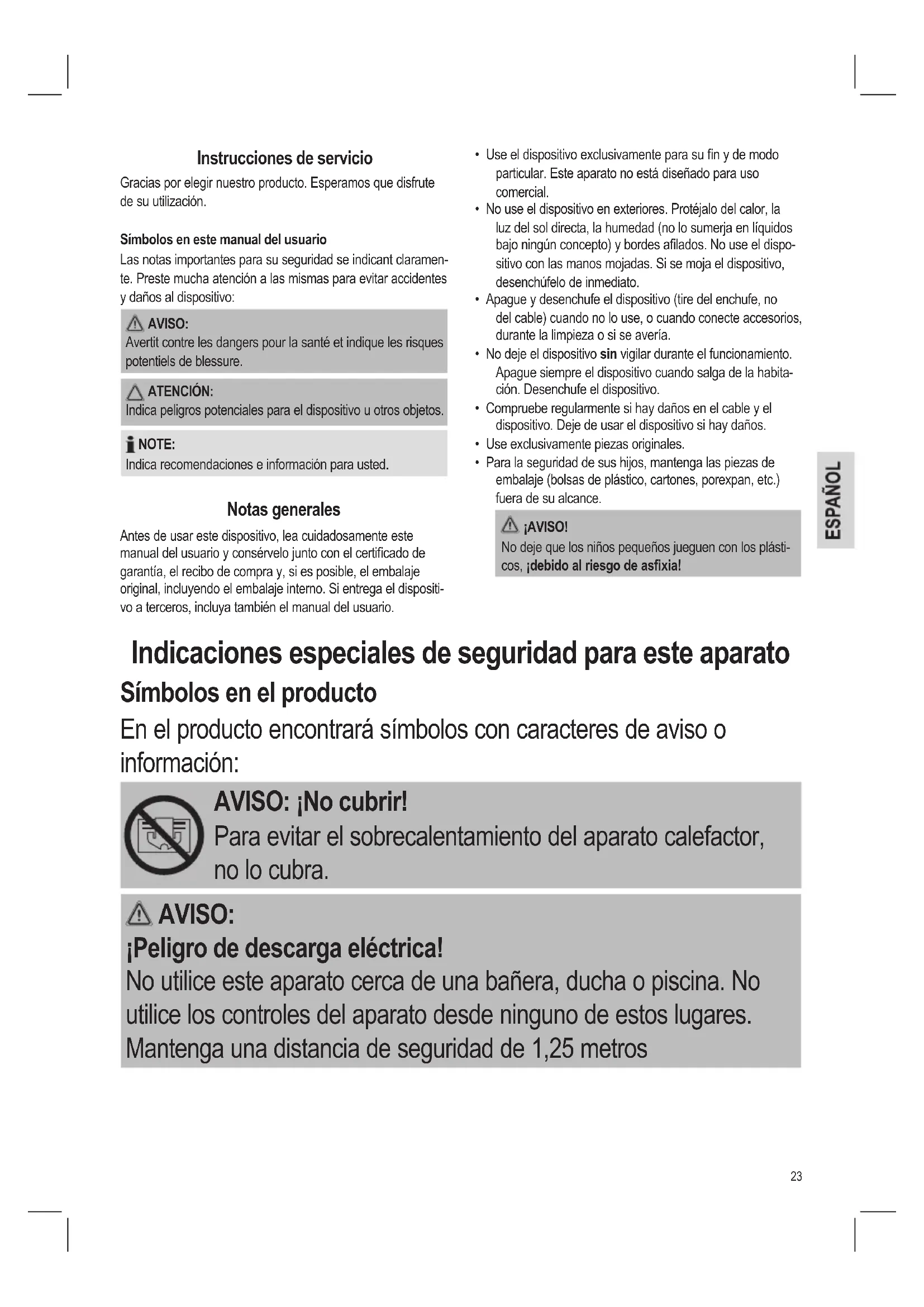 - Para la seguridad de sus hijos, mantenga las piezas de embalaje (bolsas de plástico, cartones, porexpan, etc.) fuera de su alcance. ¡AVISO! No deje que los niños pequeños jueguen con los plásti- cos, ¡debido al riesgo de asxia! Instrucciones de servicio Gracias por elegir nuestro producto. Esperamos que disfrute de su utilización. Símbolos en este manual del usuario Las notas importantes para su seguridad se indicant claramen- te. Preste mucha atención a las mismas para evitar accidentes y daños al dispositivo: AVISO: Avertit contre les dangers pour la santé et indique les risques potentiels de blessure. ATENCIÓN: Indica peligros potenciales para el dispositivo u otros objetos. NOTE: Indica recomendaciones e información para usted. Notas generales Antes de usar este dispositivo, lea cuidadosamente este manual del usuario y consérvelo junto con el certicado de garantía, el recibo de compra y, si es posible, el embalaje original, incluyendo el embalaje interno. Si entrega el dispositi- vo a terceros, incluya también el manual del usuario. Indicaciones especiales de seguridad para este aparato Símbolos en el producto En el producto encontrará símbolos con caracteres de aviso o información: AVISO: ¡No cubrir! Para evitar el sobrecalentamiento del aparato calefactor, no lo cubra. AVISO: ¡Peligro de descarga eléctrica! No utilice este aparato cerca de una bañera, ducha o piscina. No utilice los controles del aparato desde ninguno de estos lugares. Mantenga una distancia de seguridad de 1,25 metros24 AVISO: Peligro de quemaduras