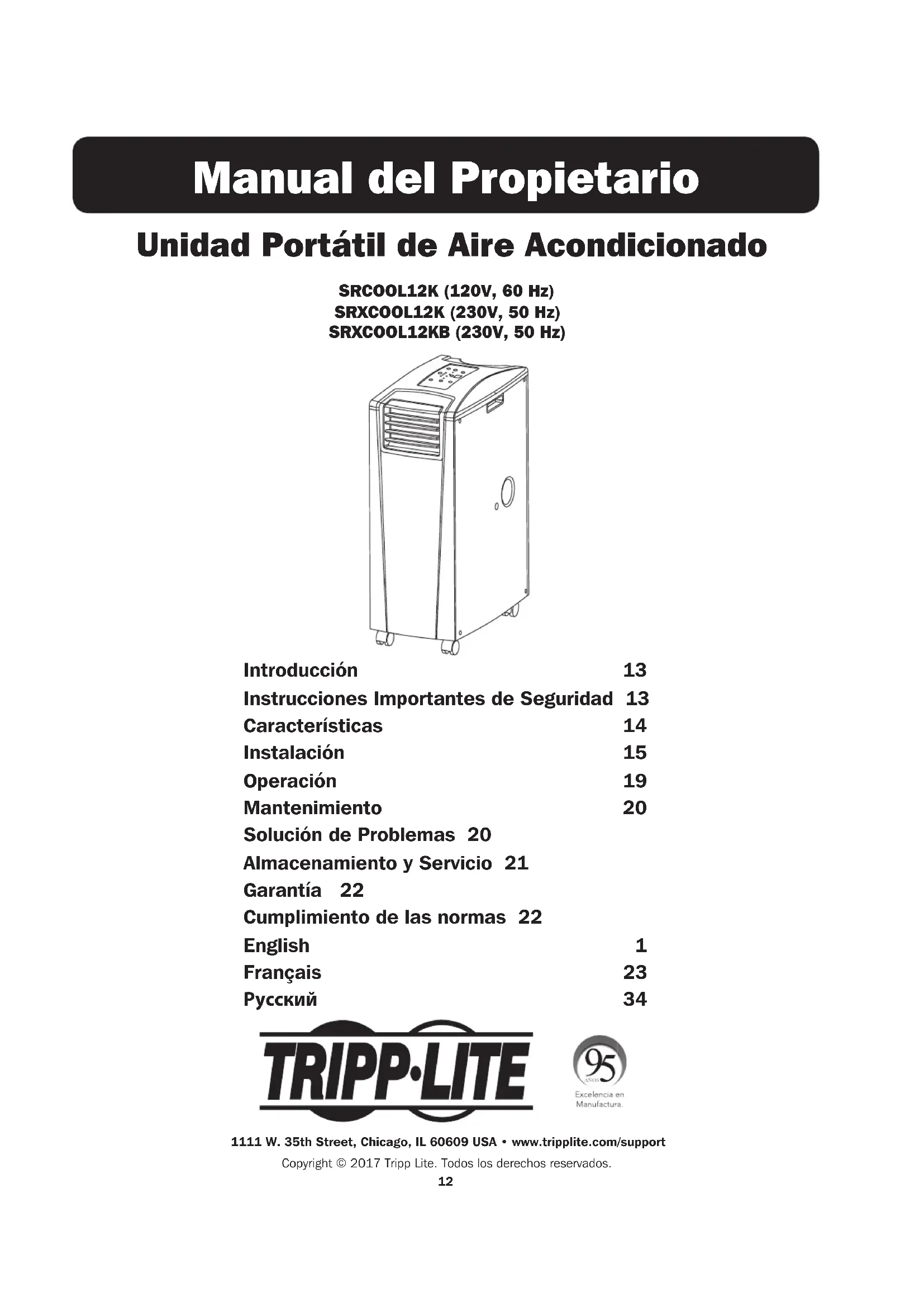 - Enviar el equipo nuevo para reciclaje cuando se transforma en desecho El uso de este equipo en aplicaciones de soporte de vida en donde la falla de este equipo pueda razonablemente hacer suponer que causará fallas en el equipo de soporte de vida o afecte significativamente su seguridad o efectividad, no está recomendado. Tripp Lite tiene la política de mejora continua. Las especificaciones del producto están sujetas a cambios sin notificación previa.23 Climatiseur portatif SRCOOL12K (120 V, 60 Hz) SRXCOOL12K (230V, 50 Hz) SRXCOOL12KB (230V, 50 Hz) Manuel du propriétaire Introduction 24 Consignes de sécurité importantes 24 Caractéristiques 25 Installation 26 Fonctionnement 30 Maintenance 31 Dépannage 31 Entreposage et service 32 Garantie 33 Conformité aux règlements 33 English 1 Español 12 Русский 34 1111 W. 35th Street, Chicago, IL 60609 USA • www.tripplite.com/support Copyright © 2017 Tripp Lite. Tous droits réservés.SYST RPS STAT DUPLXSPEED MODE 15X31X33X47X