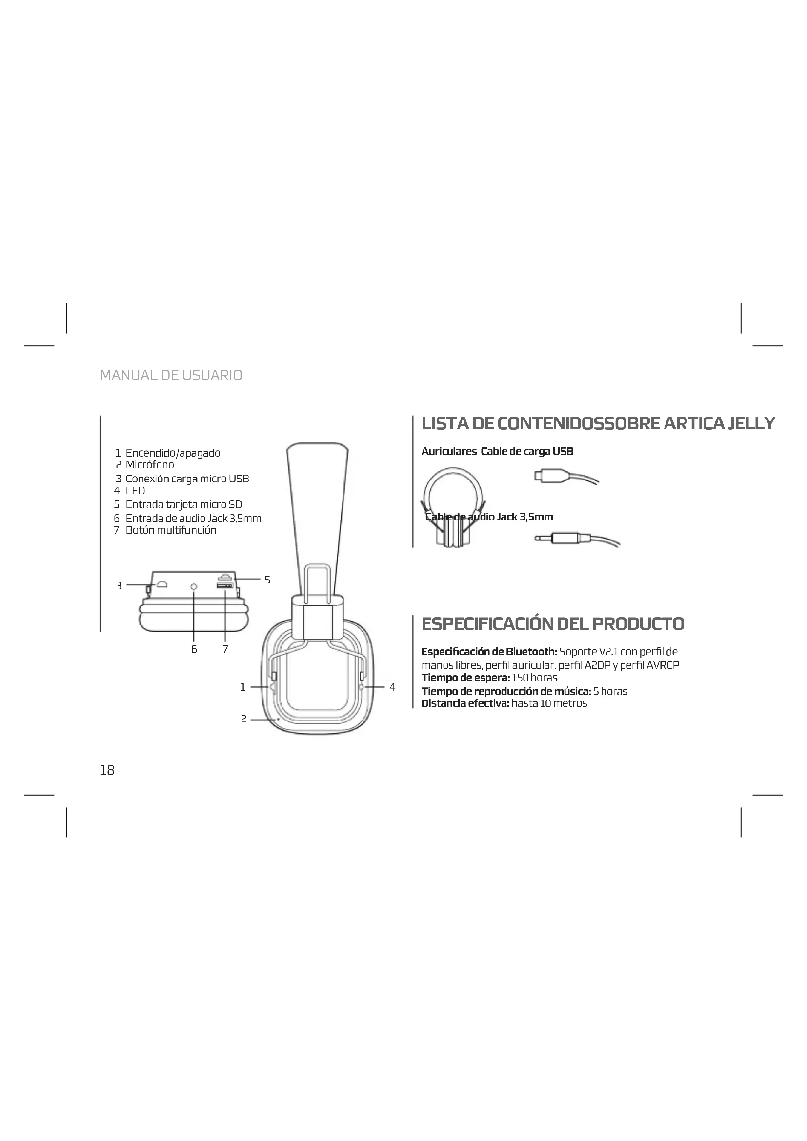 Especificación de Bluetooth: Soporte V2.1 con perfil de manos libres, perfil auricular, perfil A2DP y perfil AVRCP Tiempo de espera: 150 horas Tiempo de reproducción de música: 5 horas Distancia efectiva: hasta 10 metros