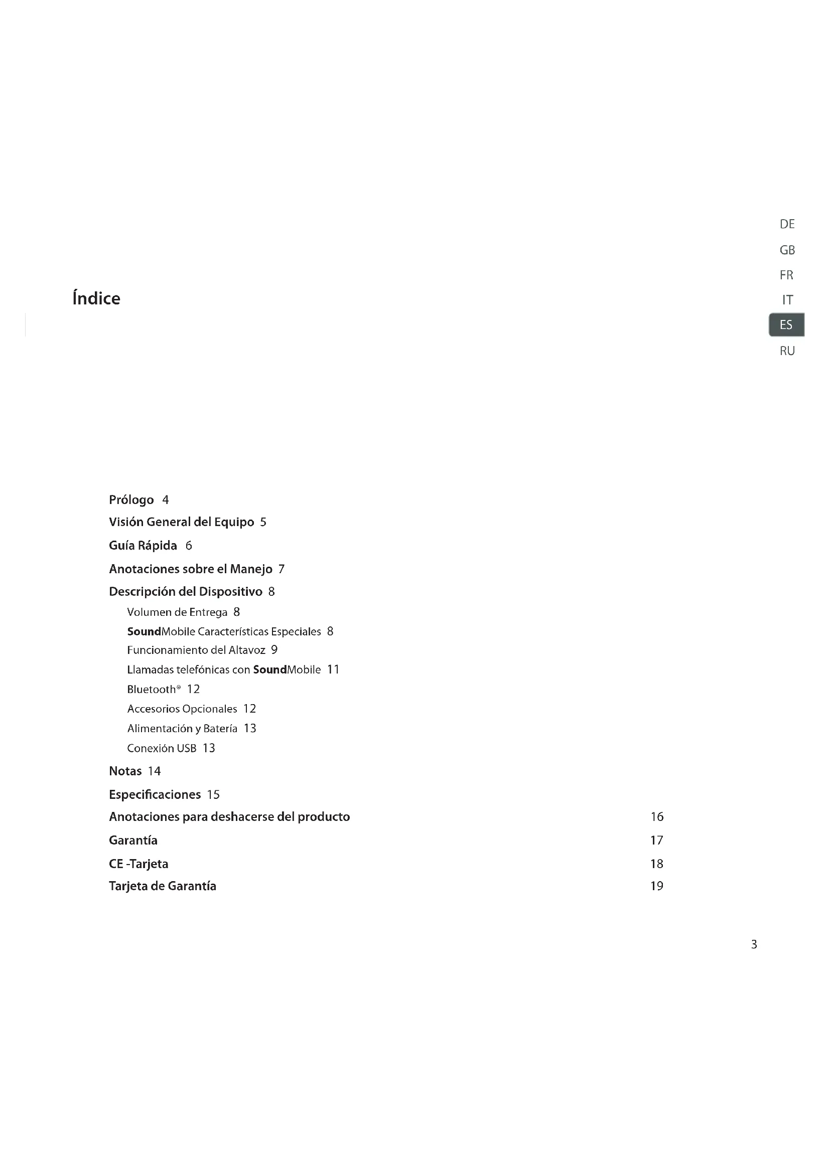water resistant3 Prólogo 4 Visión General del Equipo 5 Guía Rápida 6 Anotaciones sobre el Manejo 7 Descripción del Dispositivo 8 Volumen de Entrega 8 SoundMobile Características Especiales 8 Funcionamiento del Altavoz 9 Llamadas telefónicas con SoundMobile 11 Bluetooth® 12 Accesorios Opcionales 12 Alimentación y Batería 13 Conexión USB 13 Notas 14 Especicaciones 15 Anotaciones para deshacerse del producto 16 Garantía 17 CE -Tarjeta 18 Tarjeta de Garantía 19 Índice
