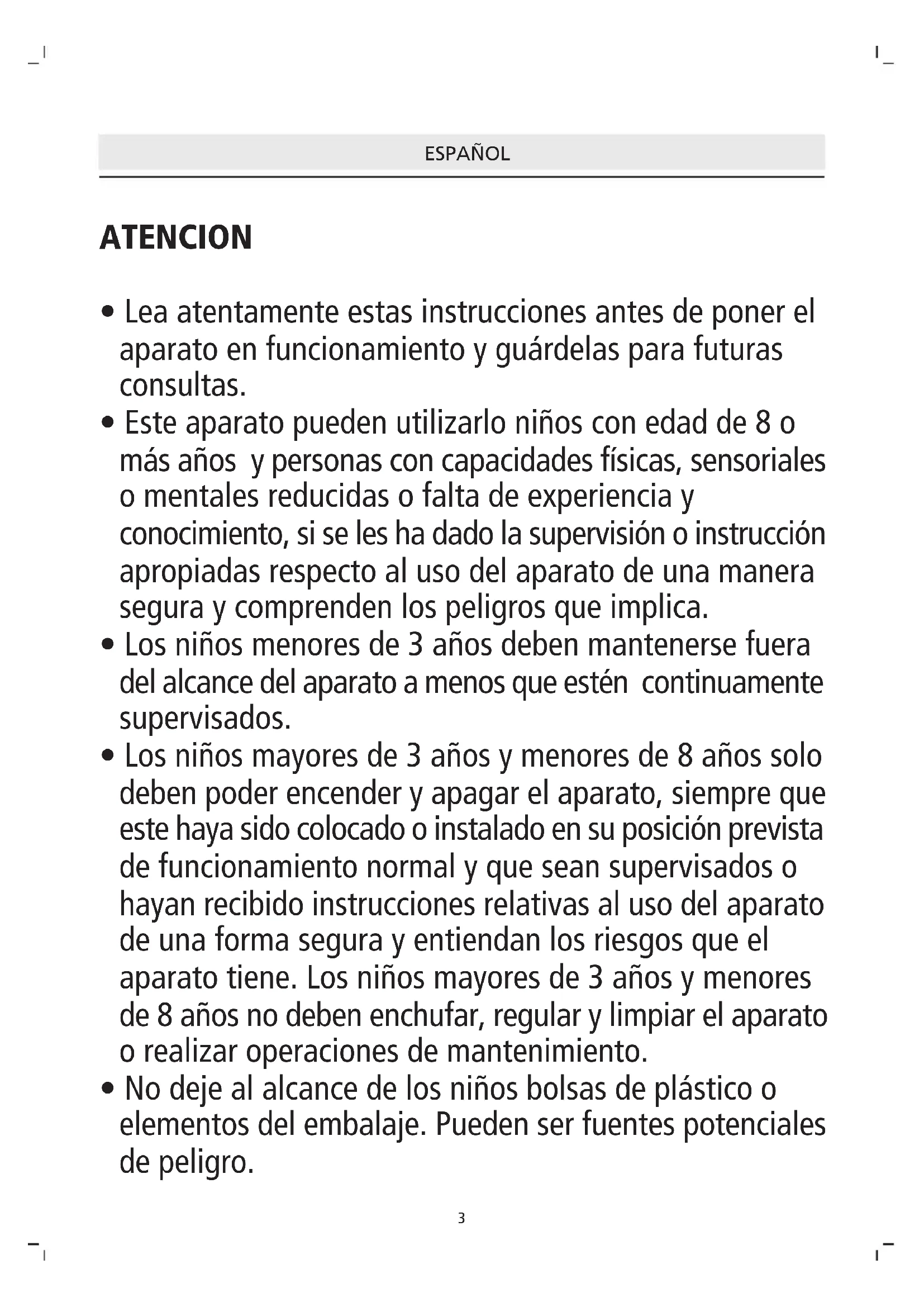 - Los niños menores de 3 años deben mantenerse fuera del alcance del aparato a menos que estén continuamente supervisados.