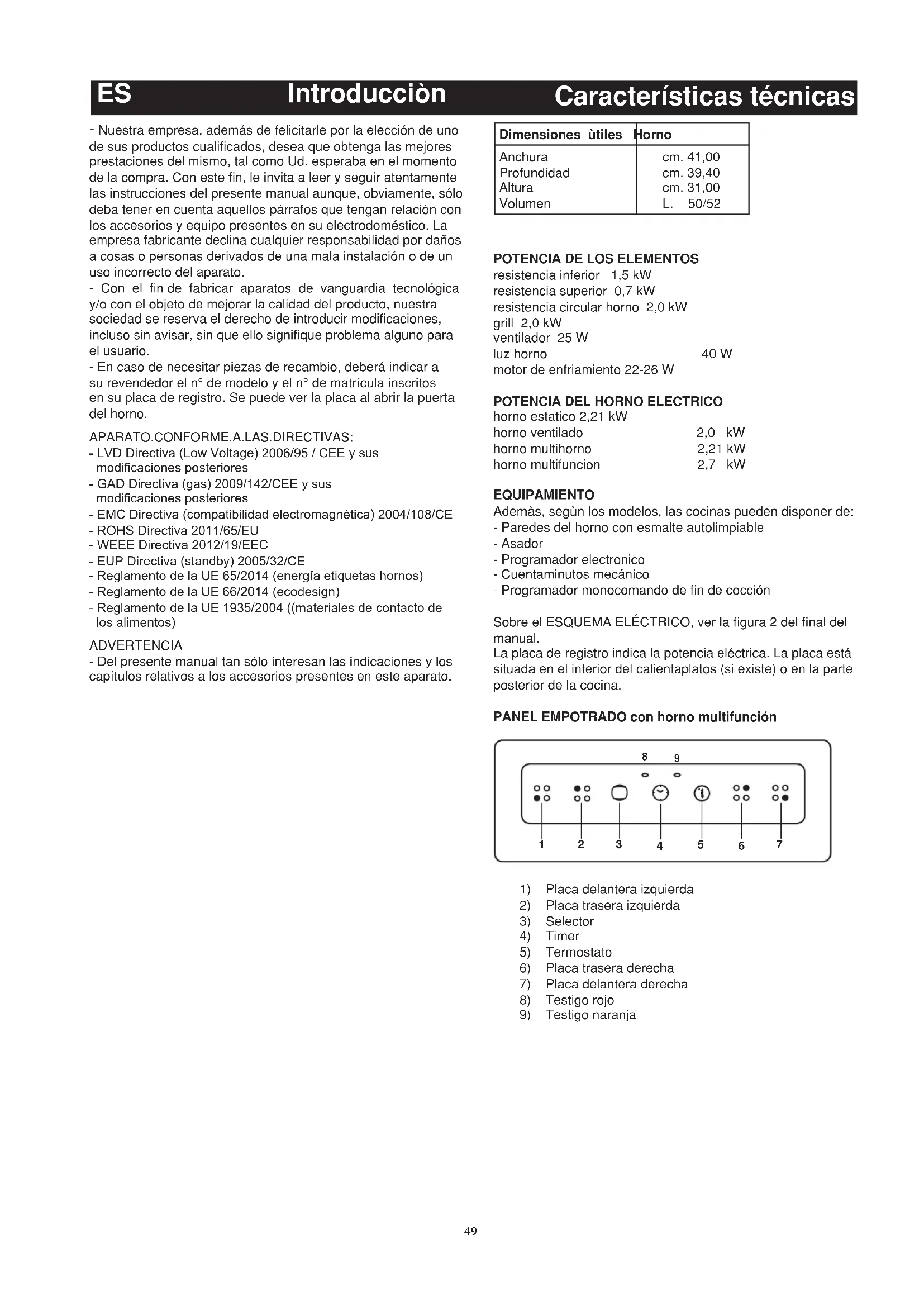 Características técnicas APARATO.CONFORME.A.LAS.DIRECTIVAS: - LVD Directiva (Low Voltage) 2006/95 / CEE y sus modificaciones posteriores - GAD Directiva (gas) 2009/142/CEE y sus modificaciones posteriores - EMC Directiva (compatibilidad electromagnética) 2004/108/CE - ROHS Directiva 2011/65/EU - WEEE Directiva 2012/19/EEC - EUP Directiva (standby) 2005/32/CE - Reglamento de la UE 65/2014 (energía etiquetas hornos) - Reglamento de la UE 66/2014 (ecodesign) - Reglamento de la UE 1935/2004 ((materiales de contacto de los alimentos)50 InstalaciònES