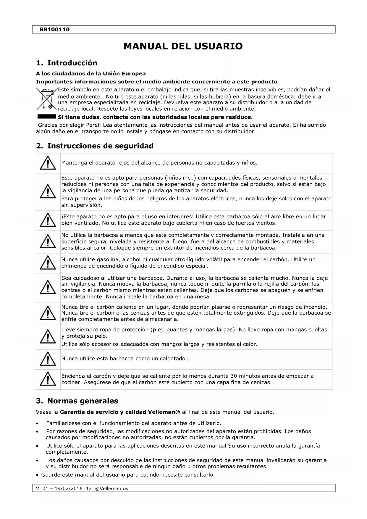 dimensiones .................................................................................................. 96 x 37 x 95 cm parrilla (2 uds.) ...................................................................................................... 40 x 33 cm cantidad de carbón recomendada ....................................................................................3.0 kg color ............................................................................................................................ negro Utilice este aparato sólo con los accesorios originales. Velleman NV no será responsable de daños ni lesiones causados por un uso (indebido) de este aparato. Para más información sobre este producto y la versión más reciente de este manual del usuario, visite nuestra página www.perel.eu. Se pueden modificar las especificaciones y el contenido de este manual sin previo aviso.