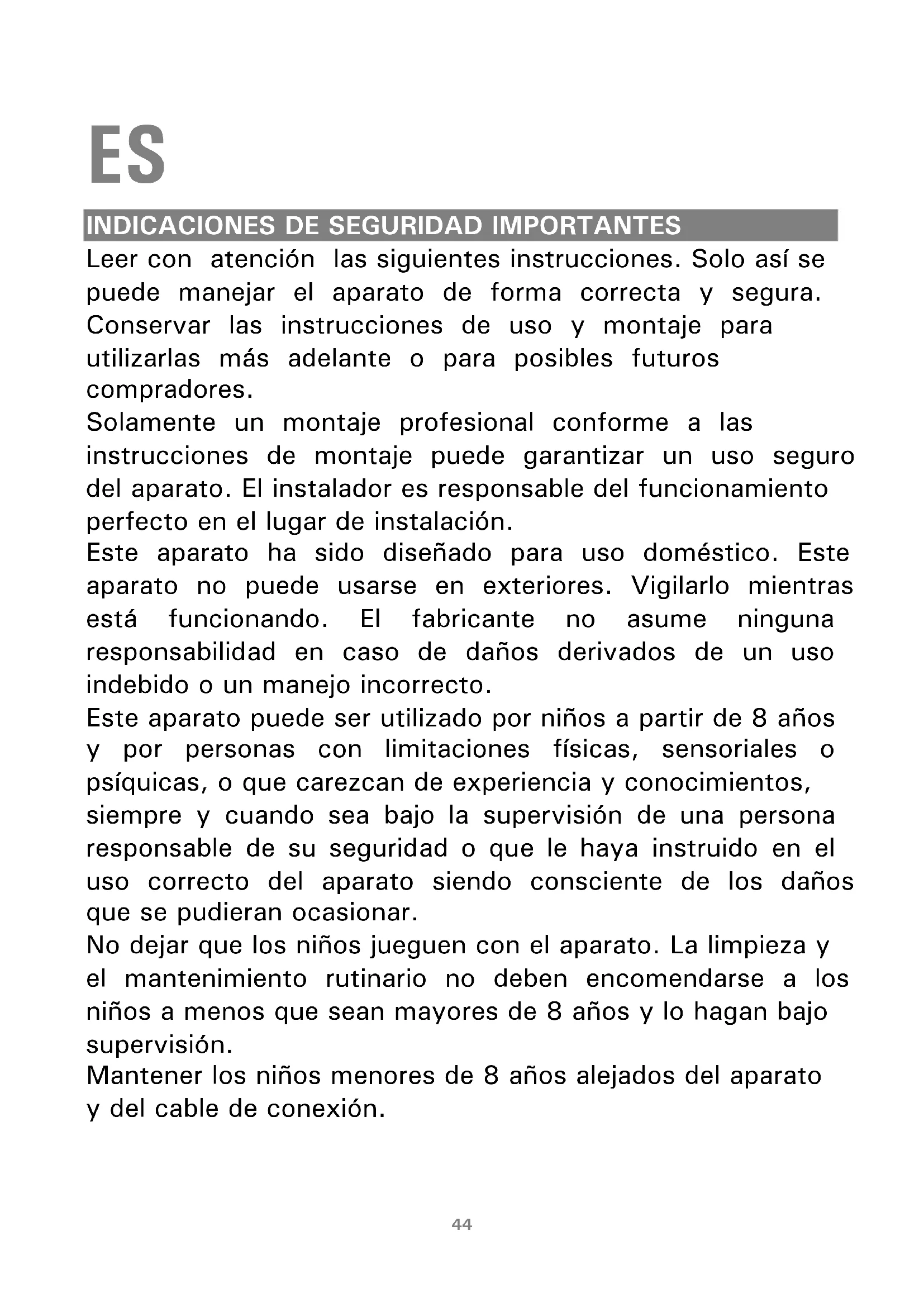Leer con atención las siguientes instrucciones. Solo así se puede manejar el aparato de forma correcta y segura. Conservar las instrucciones de uso y montaje para utilizarlas más adelante o para posibles futuros compradores. Solamente un montaje profesional conforme a las instrucciones de montaje puede garantizar un uso seguro del aparato. El instalador es responsable del funcionamiento perfecto en el lugar de instalación. Este aparato ha sido diseñado para uso doméstico. Este aparato no puede usarse en exteriores. Vigilarlo mientras está funcionando. El fabricante no asume ninguna responsabilidad en caso de daños derivados de un uso indebido o un manejo incorrecto. Este aparato puede ser utilizado por niños a partir de 8 años y por personas con limitaciones físicas, sensoriales o psíquicas, o que carezcan de experiencia y conocimientos, siempre y cuando sea bajo la supervisión de una persona responsable de su seguridad o que le haya instruido en el uso correcto del aparato siendo consciente de los daños que se pudieran ocasionar. No dejar que los niños jueguen con el aparato. La limpieza y el mantenimiento rutinario no deben encomendarse a los niños a menos que sean mayores de 8 años y lo hagan bajo supervisión. Mantener los niños menores de 8 años alejados del aparato y del cable de conexión.45 Comprobar el aparato al sacarlo de su embalaje. El aparato no debe conectarse en caso de haber sufrido daños durante el transporte. Los aparatos sin enchufe deben ser conectados exclusivamente por técnicos especialistas autorizados. Los daños provocados por una conexión incorrecta no están cubiertos por la garantía. ¡Peligro de asfixia! El material de embalaje es peligroso para los niños. No dejar que los niños jueguen con el material de embalaje. ¡Peligro mortal! Los gases de combustión que se vuelven a aspirar pueden ocasionar intoxicaciones. Garantice una entrada de aire suficiente si el aparato se emplea en modo de funcionamiento en salida de aire al exterior junto con un equipo calefactor dependiente del aire del recinto de instalación. Los equipos calefactores que dependen del aire del recinto de instalación (p. ej., calefactores de gas, aceite, madera o carbón, calentadores de salida libre, calentadores de agua) adquieren aire de combustión del recinto de instalación y evacuan los gases de escape al exterior a través de un sistema extractor (p. ej., una chimenea). En combinación con una campana extractora conectada se extrae aire de la cocina y de las habitaciones próximas; sin una entrada de aire suficiente se genera una depresión. Los gases venenosos procedentes de la chimenea o del hueco de ventilación se vuelven a aspirar en las habitaciones.46 ■ Por tanto, asegurarse de que siempre haya una entrada de aire suficiente. ■ Un pasamuros de entrada/salida de aire no es garantía por sí solo del cumplimiento del valor límite. A fin de garantizar un funcionamiento seguro, la depresión en el recinto de instalación de los equipos calefactores no debe superar 4 Pa (0,04 mbar). Esto se consigue si, mediante aberturas que no se pueden cerrar, p. ej., en puertas, ventanas, en combinación con un pasamuros de entrada/salida de aire o mediante otras medidas técnicas, se puede hacer recircular el aire necesario para la combustión. Pedir siempre asesoramiento al técnico competente de su región, que estará en condiciones de evaluar todo el sistema de ventilación de su hogar y recomendarle las medidas adecuadas en materia de ventilación. Si la campana extractora se utiliza exclusivamente en funcionamiento en recirculación, no hay limitaciones para el funcionamiento. ¡Peligro de incendio! ■ Los depósitos de grasa del filtro de grasas pueden prenderse. Los filtros de grasa deben limpiarse por lo menos cada 2 meses. No usar nunca el aparato sin filtro de grasa. ■ Los depósitos de grasa del filtro de grasas pueden prenderse. Nunca trabaje con una llama directa cerca del aparato (p. ej., flambear). Instalar el aparato cerca de un equipo calefactor para combustibles sólidos (p. ej.,47 madera o carbón) solo si se dispone de una cubierta cerrada no desmontable. No deben saltar chispas. ■ El aceite caliente y la grasa se inflaman con facilidad. Estar siempre pendiente del aceite caliente y de la grasa. No apagar nunca con agua un fuego. Apagar la zona de cocción. Sofocar con cuidado las llamas con una tapa, una tapa extintora u otro medio similar. ¡Peligro de quemaduras! Las partes accesibles se calientan durante el funcionamiento. No tocar nunca las partes calientes. No dejar que los niños se acerquen. ¡Peligro de lesiones! Las piezas internas del aparato pueden tener bordes afilados. Usar guantes protectores. ¡Peligro de descarga eléctrica! ■ Un aparato defectuoso puede ocasionar una descarga eléctrica. No conectar nunca un aparato defectuoso. Desenchufar el aparato de la red o desconectar el fusible de la caja de fusibles. Avisar al Servicio de Asistencia Técnica. ■ Las reparaciones inadecuadas son peligrosas. Las reparaciones y la sustitución de cables de conexión defectuosos solo pueden ser efectuadas por personal del Servicio de Asistencia Técnica debidamente instruido. Si el aparato está averiado, desenchufarlo de la red o desconectar el fusible de la caja de fusibles. Avisar al Servicio de Asistencia Técnica. ■ La humedad interior puede provocar una descarga eléctrica. No utilizar ni limpiadores de alta presión ni por chorro de vapor.48