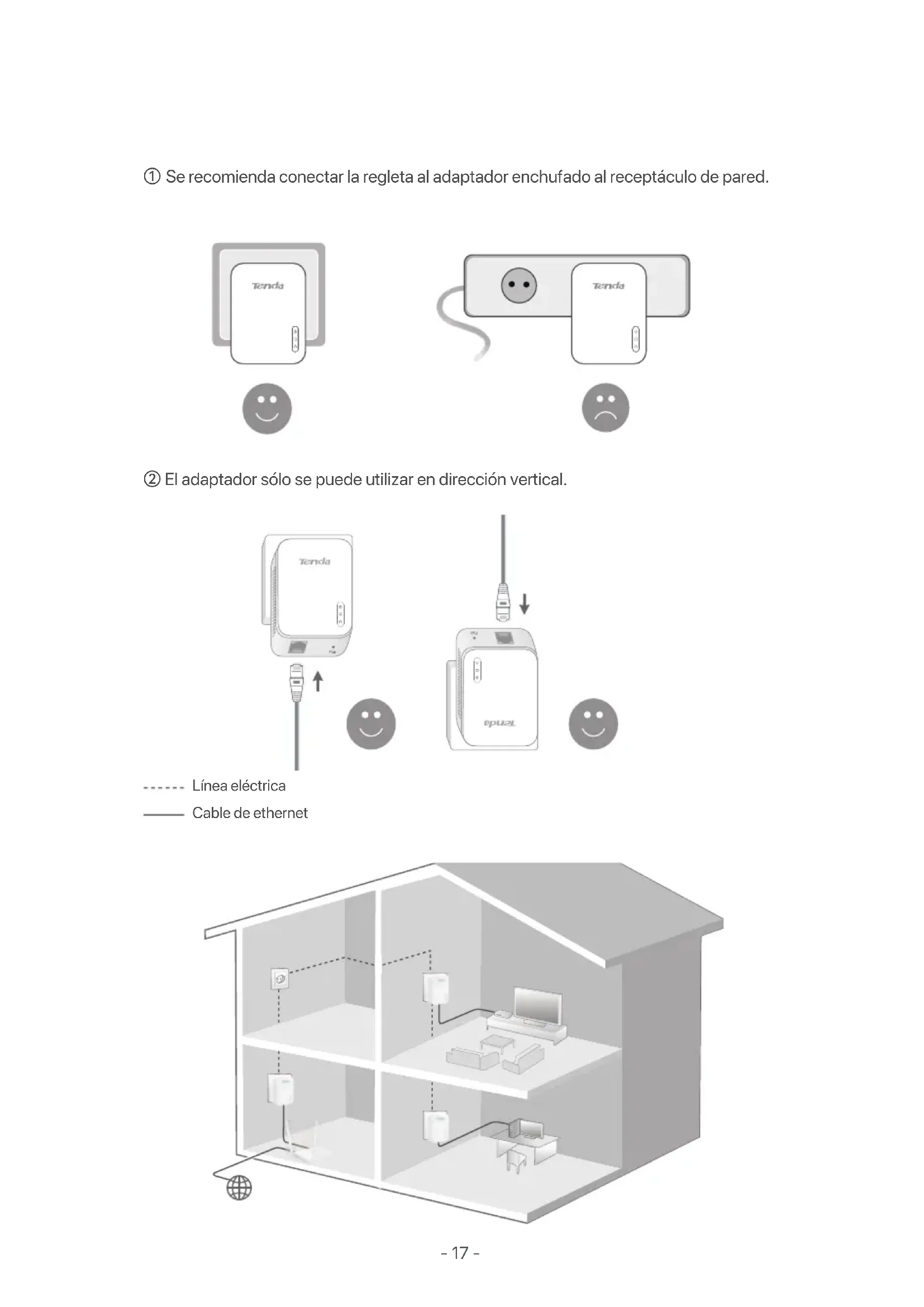 - Használja a Pair gombot, hogy újra párosítsa egy másik adapterrel az elektromos hálózatban. V3: Próbálkozzon a következő módszerekkel:- 17 - Español Atención ② El adaptador sólo se puede utilizar en dirección vertical. ① Se recomienda conectar la regleta al adaptador enchufado al receptáculo de pared. Línea eléctrica Cable de ethernet-18- Conecte un adaptador a un puerto LAN de un enrutador para acceder a Internet y conéctelo a un receptáculo de pared cercano. Conecte el otro adaptador a un dispositivo con cable, como un decodificador, y conéctelo a un receptáculo de pared. Espere hasta que los indicadores LED del PLC de los dos adaptadores se enciendan de forma fija.-19- (Opcional) Asegure su red Powerline