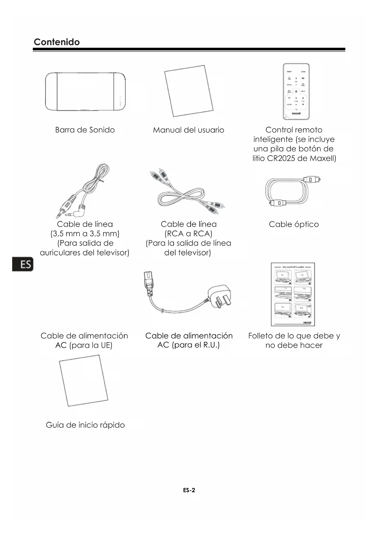 Precaución con las pilas Si el control remoto inteligente no va a utilizarse por un periodo prolongado (más de un mes), extraiga la pila para evitar que se produzcan fugas. Si las pilas tienen fugas, limpie la fuga dentro del compartimento de la pila y cambie las pilas por otras nuevas. No utilice pilas distintas a las especificadas. No caliente ni desarme las pilas. Nunca las arroje al fuego ni al agua. No transporte ni almacene las pilas junto con otros objetos metálicos. Si lo hace, podría provocar fugas o cortocircuitos en las pilas o estas podrían explotar. Nunca recargue una pila a menos que confirme que se trata de una pila recargable.Conexiones ES-8 Colocar el televisor en la parte superior La barra de sonido MXSB-252BT de Maxell se diseñó para que pudiera utilizarla con televisores que no sobrepasen las 50 kg, que cuenten con una base que no sea de más de 53 cm de ancho y que no tengan una profundidad de más de 30 cm. La barra MXSB-252BT es ideal para la mayoría de los televisores de 42”. Sin embargo, NO utilice un televisor con tubos de rayos catódicos (CRT) con este sistema. El sistema no se diseñó para que pudiera utilizarlo con este tipo de televisores. Lea el folleto de lo que debe y no debe hacer para que conozca la posición correcta de instalación de la unidad. Advertencia: Baje el volumen del televisor o de otras fuentes de audio antes de realizar la conexión. Podría escucharse un sonido fuerte repentino. Conexión a la alimentación Precaución: riesgo de daño al producto. - Asegúrese de que el voltaje de la toma de CA coincida con el voltaje impreso en la parte posterior o inferior de la unidad. - Riesgo de descarga eléctrica. Para desconectar el cable de alimentación de CA, tire siempre del enchufe. Nunca tire del cable. - Asegúrese de que el cable de alimentación sea el correcto.