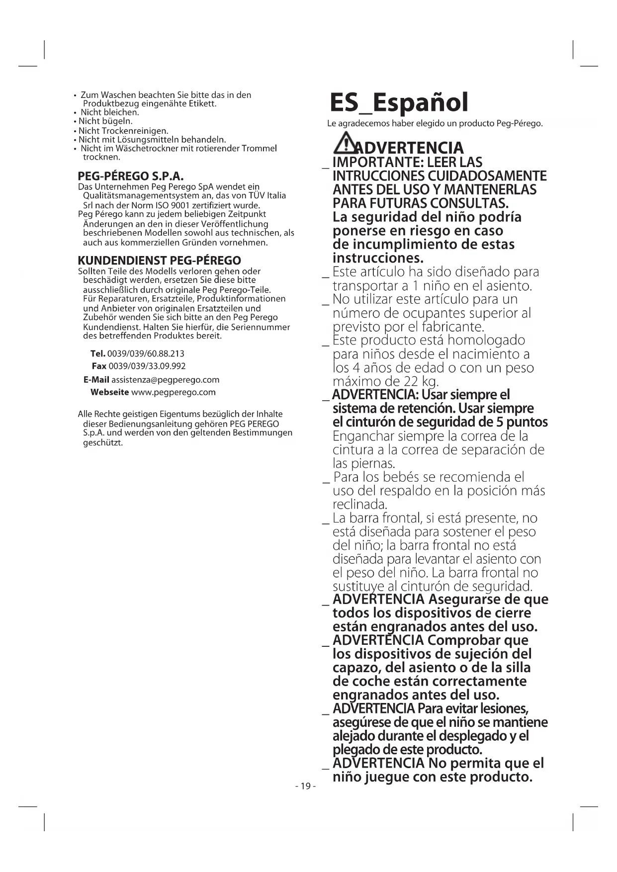 Si se pierden o dañan algunas partes del modelo, utilizar únicamente repuestos originales Peg Pérego. Para cualquier reparación, sustitución, información acerca de los productos, venta de repuestos originales y accesorios, contactar con el Servicio de Asistencia Peg Pérego indicando, el número de serie del producto. tel. 0039/039/60.88.213 fax 0039/039/33.09.992 e-mail assistenza@pegperego.com sito internet www.pegperego.com Todos los derechos de propiedad intelectual sobre los contenidos de este manual de instrucciones pertenecen a PEG PEREGO S.p.A. y están protegidos por las leyes vigentes. PT_Portoghese Obrigado por ter adquirido um produto Peg-Pérego. AVISO _ IMPORTANTE: LEIA