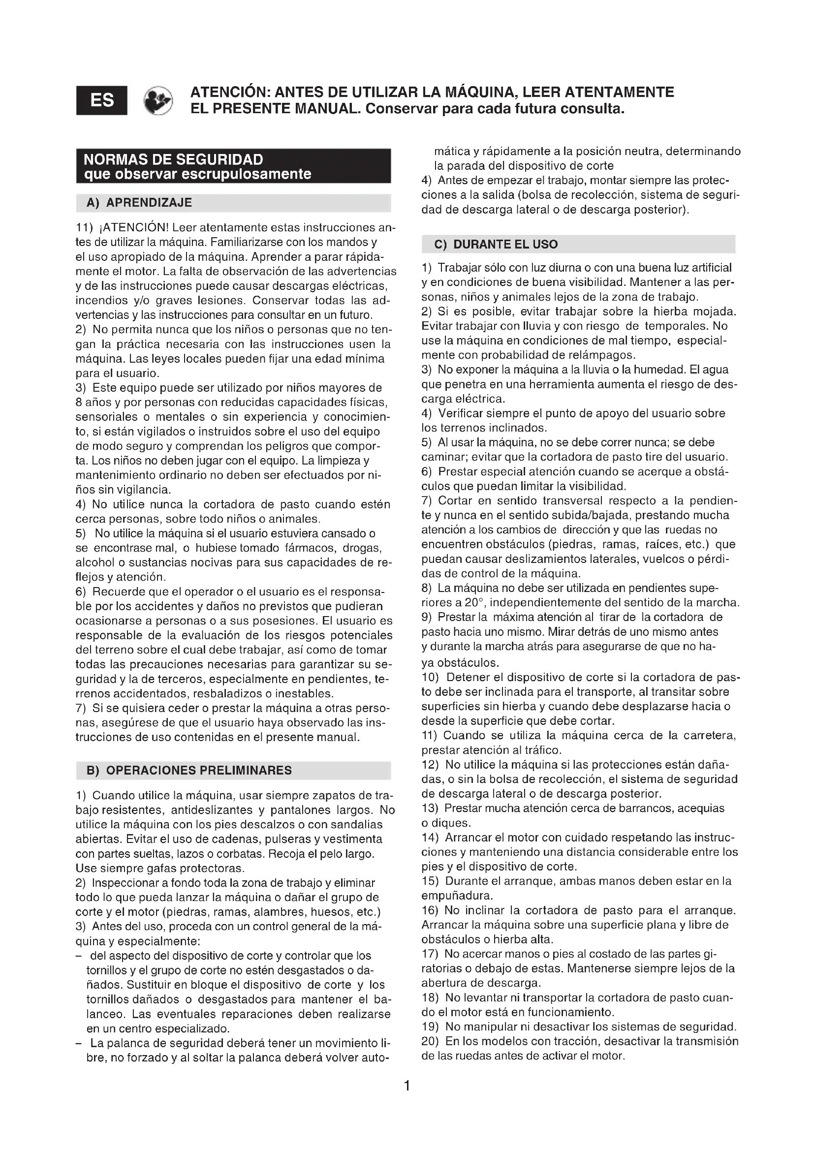 ATENCIÓN: ANTES DE UTILIZAR LA MÁQUINA, LEER ATENTAMENTE EL PRESENTE MANUAL. Conservar para cada futura consulta. mática y rápidamente a la posición neutra, determinando la parada del dispositivo de corte