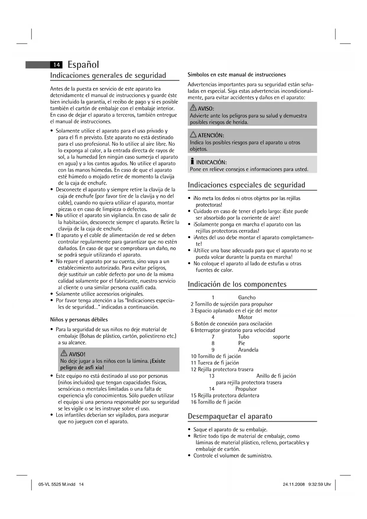 Datos técnicos Modelo: ............................................................................VL 5525 M Suministro de tensión: ...................................220-240 V, 50 Hz Consumo de energía: .............................................................30 W Clase de protección: ........................................................................Ι Peso neto: ...............................................................................2,90 kg Este aparato se ha examinado según las normativas actuales y vigentes de la Comunidad Europea, como p.ej. compatibilidad electromagnética y directiva de baja tensión y se ha construido según las más nuevas especi - caciones en razón de la seguridad. No reservamos el derecho de efectuar modi caciones técnicas. Signi cado del símbolo „Cubo de basura“ Proteja nuestro medio ambiente, aparatos eléctricos no forman parte de la basura doméstica. Haga uso de los centros de recogida previstos para la eliminación de aparatos eléctricos y entregue allí sus aparatos eléctricos que no vaya a utilizar más. Ayudará en evitar las potenciales consecuencias, a causa de una erronéa eliminación de desechos, para el medio ambiente y la salud humana. Con ello, contribuirá a la recuperación, al reciclado y a otras formas de reutilización de los aparatos viejos eléctricos y electrónicos. La información cómo se debe eliminar los aparatos, se obtiene en su ayuntamiento o su administración municipal. 05-VL 5525 M.indd 1605-VL 5525 M.indd 16 24.11.2008 9:33:00 Uhr24.11.2008 9:33:00 UhrPortuguês