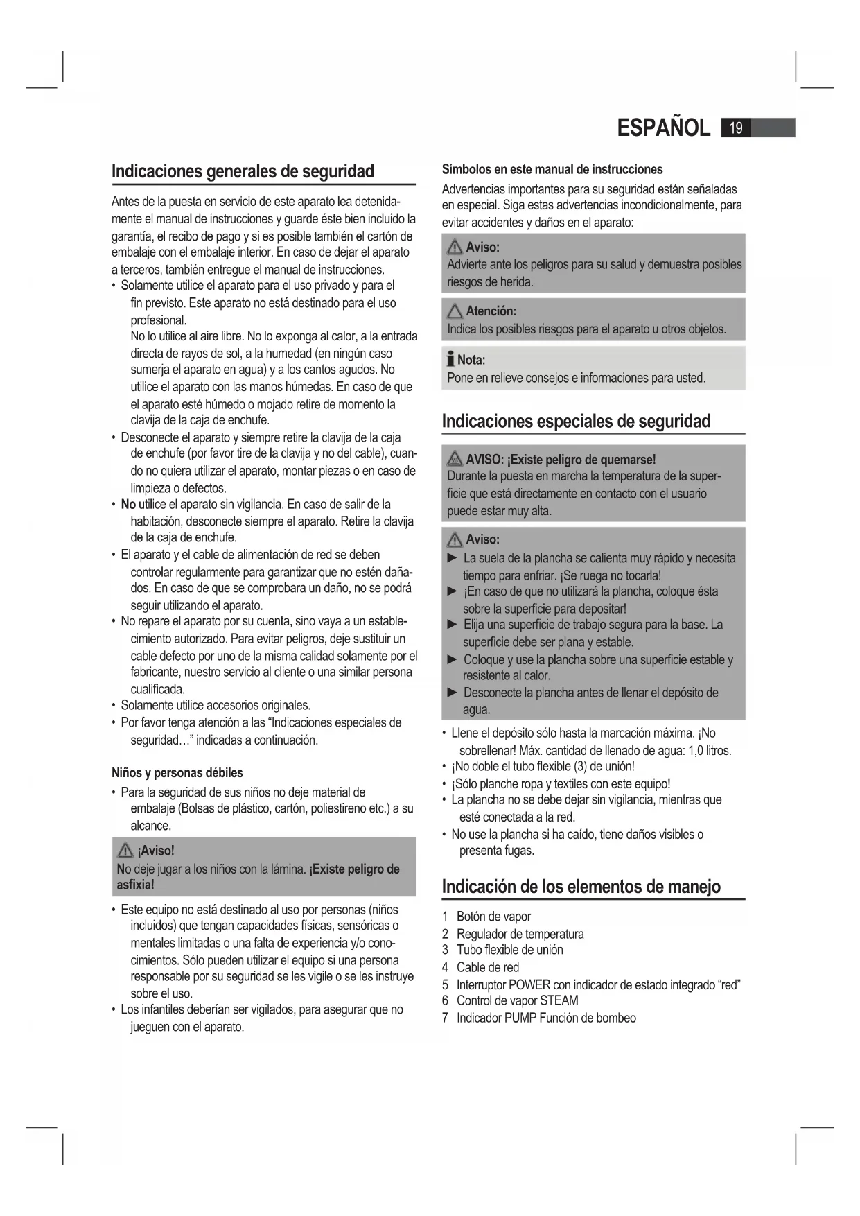 - Los infantiles deberían ser vigilados, para asegurar que no jueguen con el aparato. Símbolos en este manual de instrucciones Advertencias importantes para su seguridad están señaladas en especial. Siga estas advertencias incondicionalmente, para evitar accidentes y daños en el aparato: A viso: Advierte ante los peligros para su salud y demuestra posibles riesgos de herida. Atención: Indica los posibles riesgos para el aparato u otros objetos. Nota: Pone en relieve consejos e informaciones para usted. Indicaciones especiales de seguridad AVISO: ¡Existe peligro de quemarse! Durante la puesta en marcha la temperatura de la super- cie que está directamente en contacto con el usuario puede estar muy alta. A viso: ► La suela de la plancha se calienta muy rápido y necesita tiempo para enfriar. ¡Se ruega no tocarla! ► ¡En caso de que no utilizará la plancha, coloque ésta sobre la supercie para depositar! ► Elija una supercie de trabajo segura para la base. La supercie debe ser plana y estable. ► Coloque y use la plancha sobre una supercie estable y resistente al calor. ► Desconecte la plancha antes de llenar el depósito de agua.