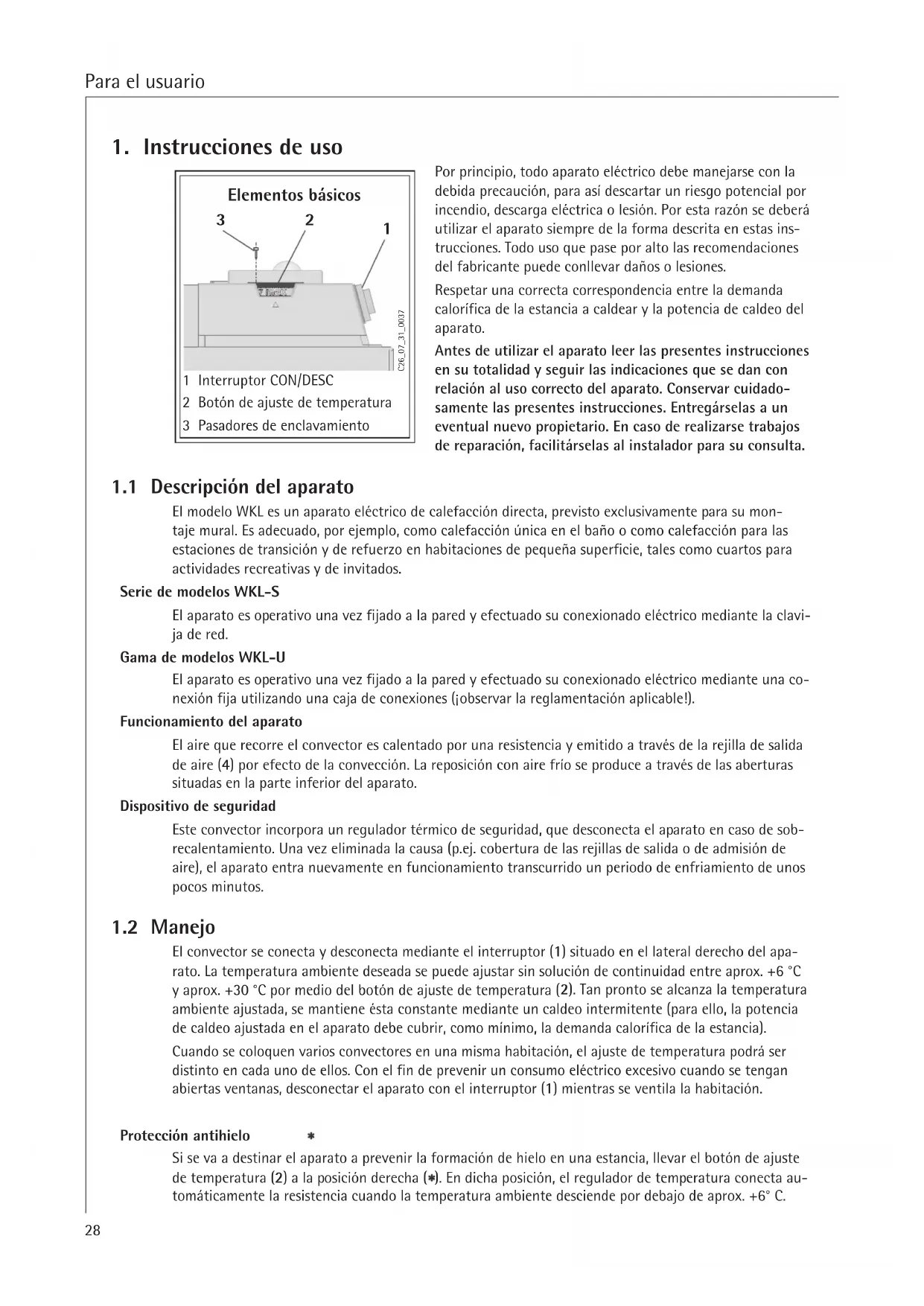 El modelo WKL es un aparato eléctrico de calefacción directa, previsto exclusivamente para su mon- taje mural. Es adecuado, por ejemplo, como calefacción única en el baño o como calefacción para las estaciones de transición y de refuerzo en habitaciones de pequeña superficie, tales como cuartos para actividades recreativas y de invitados. Serie de modelos WKL-S El aparato es operativo una vez fijado a la pared y efectuado su conexionado eléctrico mediante la clavi- ja de red. Gama de modelos WKL-U El aparato es operativo una vez fijado a la pared y efectuado su conexionado eléctrico mediante una co- nexión fija utilizando una caja de conexiones (¡observar la reglamentación aplicable!). Funcionamiento del aparato El aire que recorre el convector es calentado por una resistencia y emitido a través de la rejilla de salida de aire (4) por efecto de la convección. La reposición con aire frío se produce a través de las aberturas situadas en la parte inferior del aparato. Dispositivo de seguridad Este convector incorpora un regulador térmico de seguridad, que desconecta el aparato en caso de sob- recalentamiento. Una vez eliminada la causa (p.ej. cobertura de las rejillas de salida o de admisión de aire), el aparato entra nuevamente en funcionamiento transcurrido un periodo de enfriamiento de unos pocos minutos.