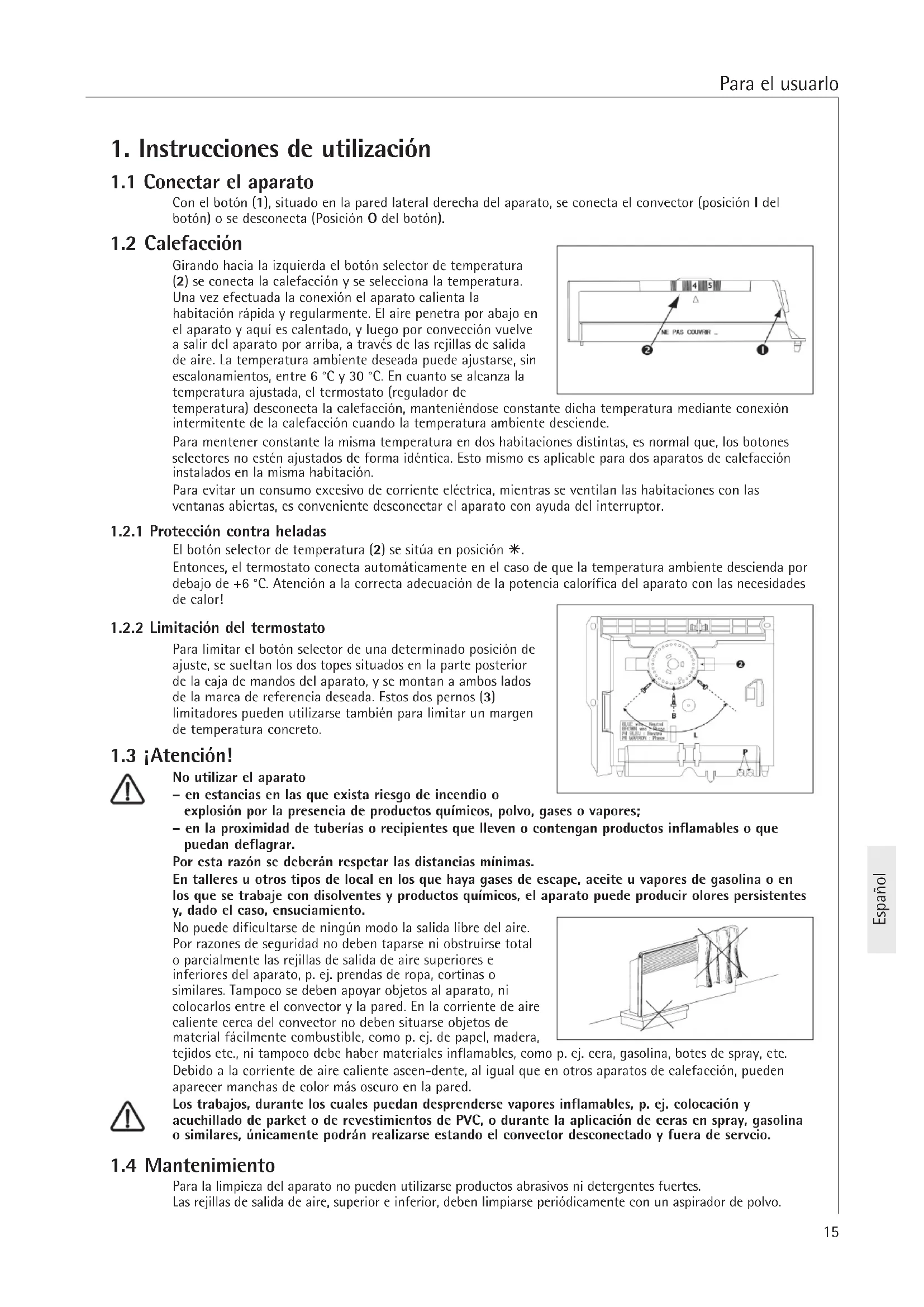 Girando hacía la izquierda el botón selector de temperatura (2) se conecta la calefacción y se selecciónla temperatura. Una vez efectuada la connexion el aparato calienta la habitación rápida y regularmente. El aire penetrar por abajo en el aparato yquiry es calentado, y bajo por convecction vuelve a salir del aparato por arriba, a trovés de las rejillas de salute de aire. La temperatura ambiente眼看ada peut ajustarse, sin escalonamente, entre 6^ y 30^. En cuando se alcanza la temperatura ajustada, el termostato (regulador de