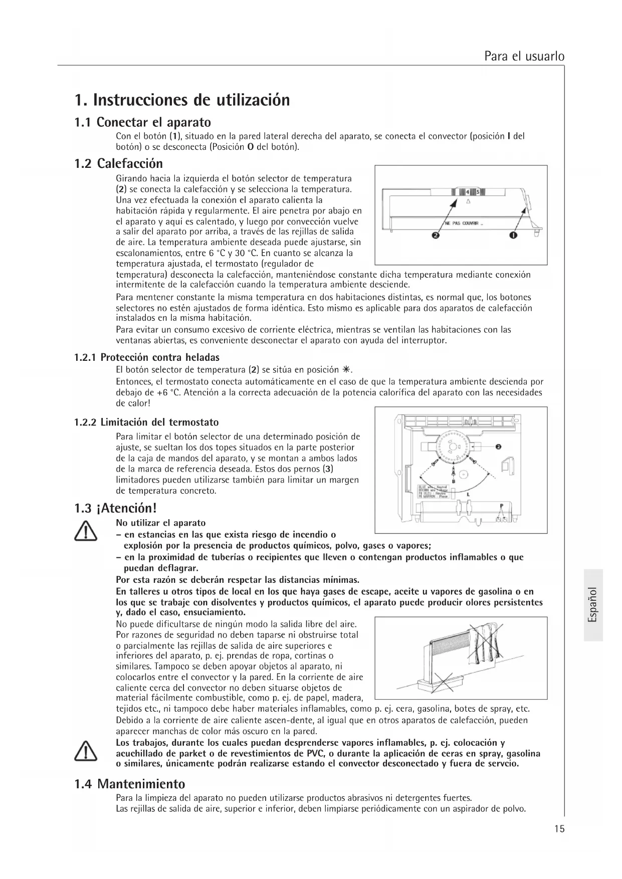 No utilizar el aparato – en estancias en las que exista riesgo de incendio o explosión por la presencia de productos químicos, polvo, gases o vapores; – en la proximidad de tuberías o recipientes que lleven o contengan productos inflamables o que puedan deflagrar. Por esta razón se deberán respetar las distancias mínimas. En talleres u otros tipos de local en los que haya gases de escape, aceite u vapores de gasolina o en los que se trabaje con disolventes y productos químicos, el aparato puede producir olores persistentes y, dado el caso, ensuciamiento. No puede dificultarse de ningún modo la salida libre del aire. Por razones de seguridad no deben taparse ni obstruirse total o parcialmente las rejillas de salida de aire superiores e inferiores del aparato, p. ej. prendas de ropa, cortinas o similares. Tampoco se deben apoyar objetos al aparato, ni colocarlos entre el convector y la pared. En la corriente de aire caliente cerca del convector no deben situarse objetos de material fácilmente combustible, como p. ej. de papel, madera, tejidos etc., ni tampoco debe haber materiales inflamables, como p. ej. cera, gasolina, botes de spray, etc. Debido a la corriente de aire caliente ascen-dente, al igual que en otros aparatos de calefacción, pueden aparecer manchas de color más oscuro en la pared. Los trabajos, durante los cuales puedan desprenderse vapores inflamables, p. ej. colocación y acuchillado de parket o de revestimientos de PVC, o durante la aplicación de ceras en spray, gasolina o similares, únicamente podrán realizarse estando el convector desconectado y fuera de servcio.