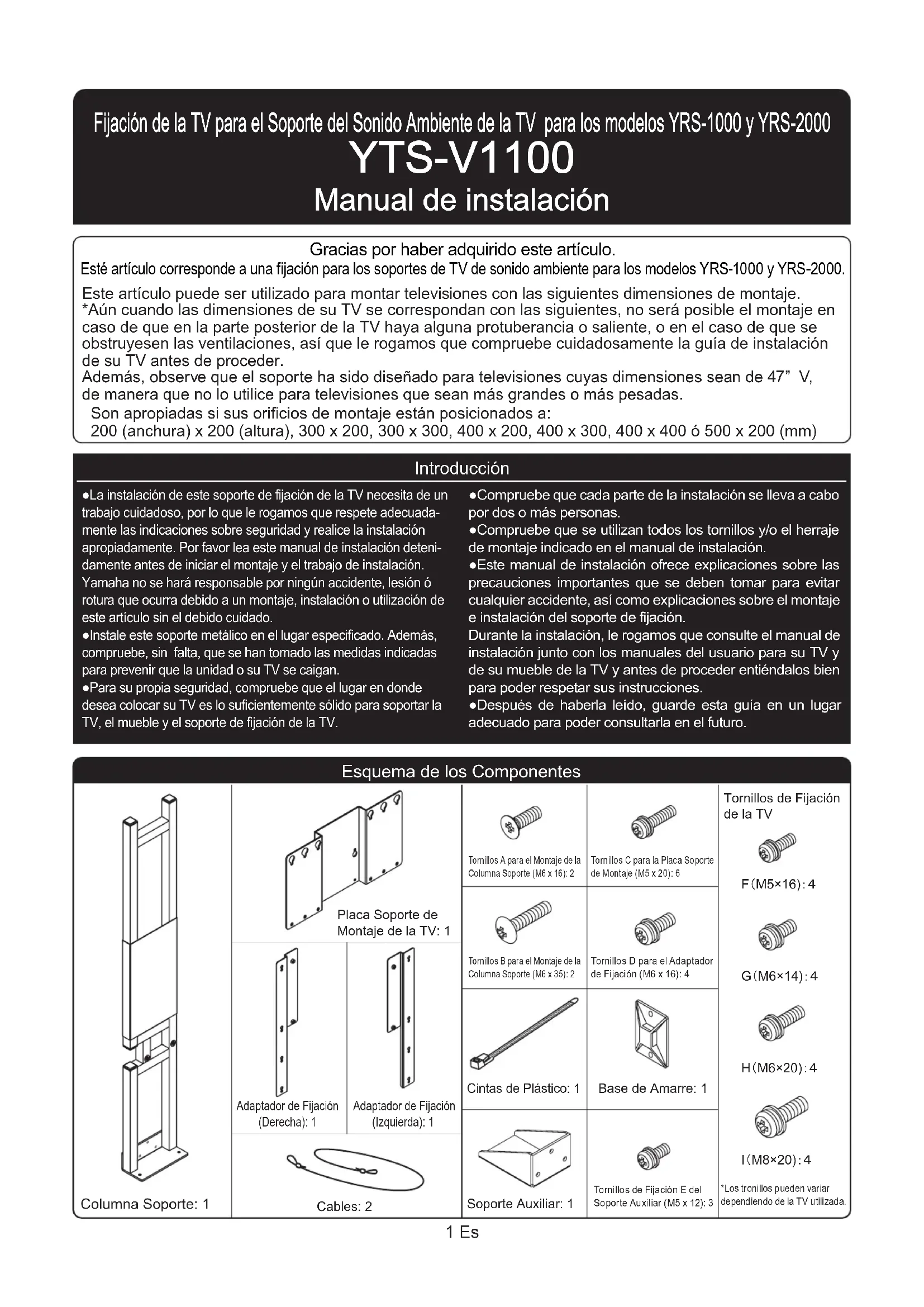Descarga las instrucciones para tu Sistema hi-fi en formato PDF gratis! Encuentra tus instrucciones YTSV1100 - YAMAHA y toma tu dispositivo electrónico nuevamente en la mano. En esta página están publicados todos los documentos necesarios para el uso de su dispositivo. YTSV1100 de la marca YAMAHA.