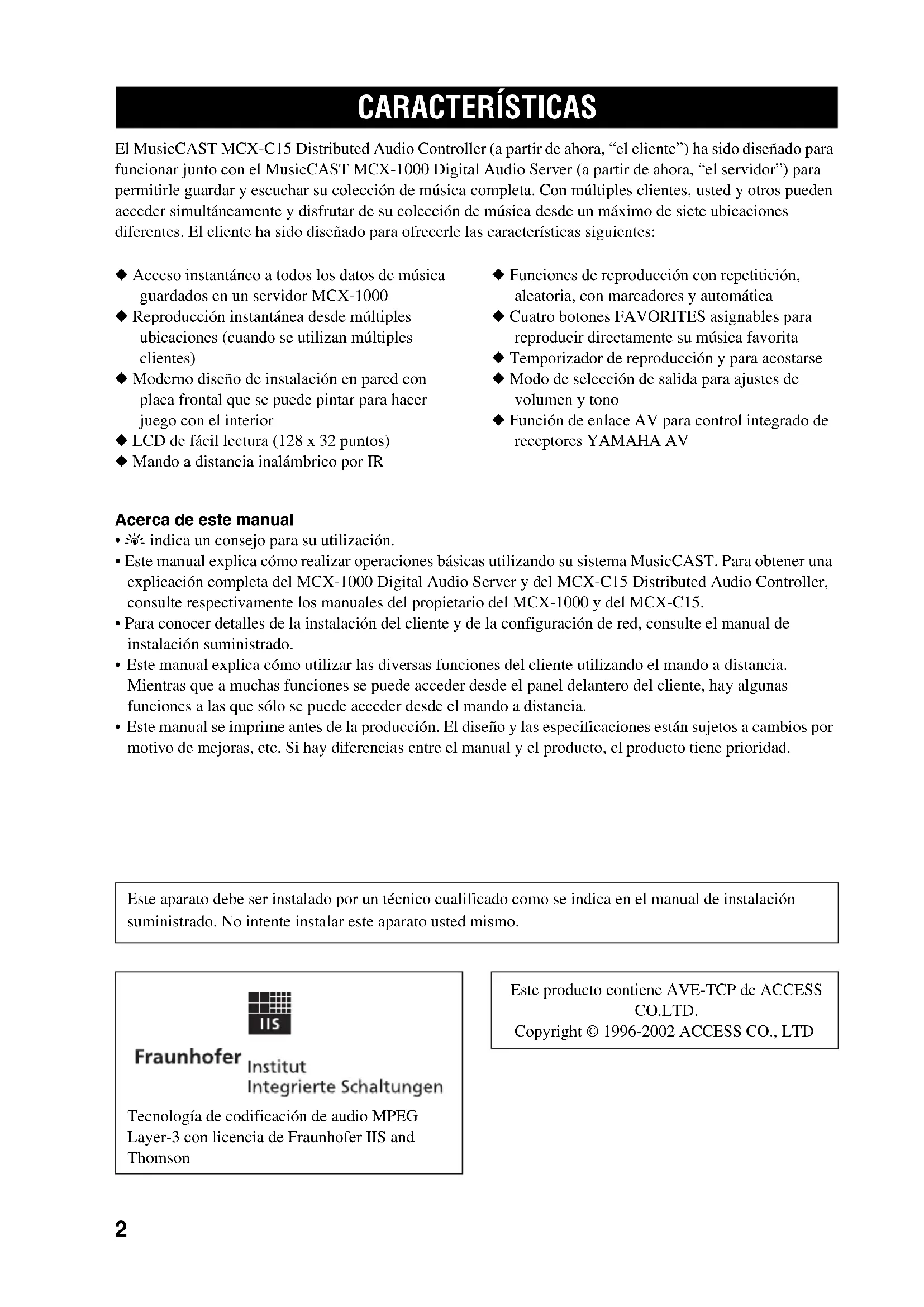 - Este manual se imprime antes de la producción. El diseño y las especificaciones están sujetos a cambios por motivo de mejoras, etc. Si hay diferencias entre el manual y el producto, el producto tiene prioridad. CARACTERÍSTICAS Este aparato debe ser instalado por un técnico cualificado como se indica en el manual de instalación suministrado. No intente instalar este aparato usted mismo. Tecnología de codificación de audio MPEG Layer-3 con licencia de Fraunhofer IIS and Thomson Este producto contiene AVE-TCP de ACCESS CO.LTD. Copyright © 1996-2002 ACCESS CO., LTD3 Español INTRODUCCIÓN Siendo posible disponer de una variedad de métodos de configuración de red utilizando una Red de Área Local (LAN), el sistema MusicCAST permite que todos los miembros de la familia guarden sus colecciones de música en una ubicación central para reproducirla desde otros puntos de su casa. Una vez guardados los datos de música, puede divertirse creando listas de reproducción y canciones con marcadores, y hasta puede registrar su música favorita para acceder a ella en un instante pulsando un botón. El sistema MusicCAST avanzado consiste en un servidor y en sus clientes conectados, y el amplificador opcional MCX-CA15 se puede conectar para proporcionar potencia a los altavoces y a los componentes externos.