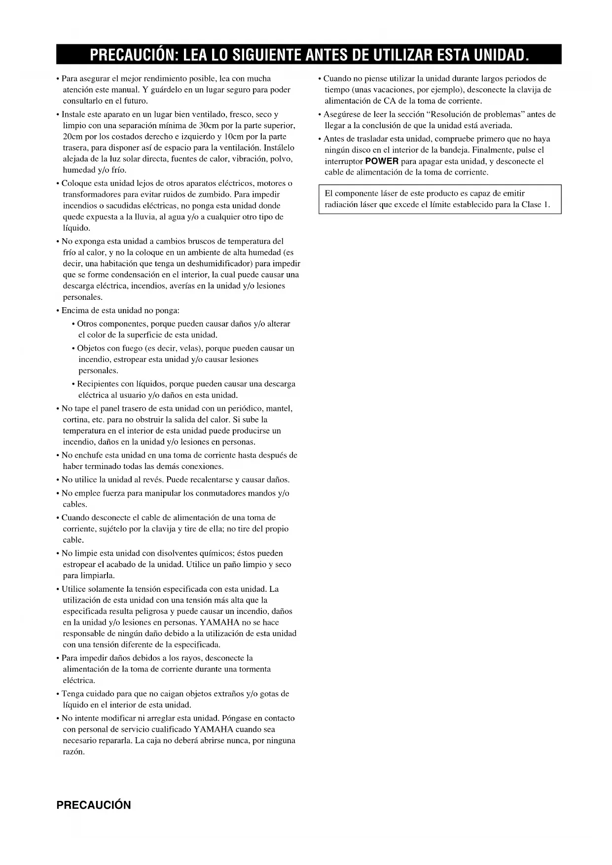 - No intente modificar ni arreglar esta unidad. Póngase en contacto con personal de servicio cualificado YAMAHA cuando sea necesario repararla. La caja no deberá abrirse nunca, por ninguna razón.