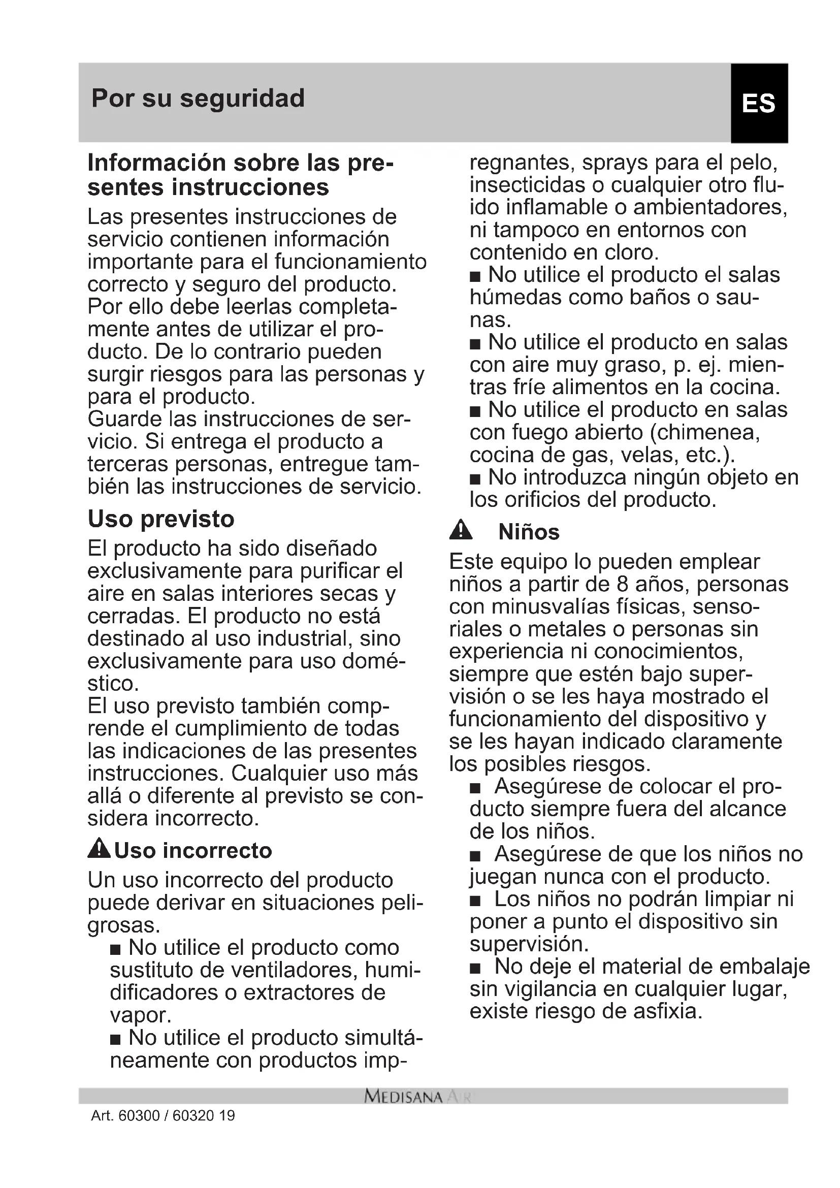 Información sobre las pre- sentes instrucciones Las presentes instrucciones de servicio contienen información importante para el funcionamiento correcto y seguro del producto. Por ello debe leerlas completa- mente antes de utilizar el pro- ducto. De lo contrario pueden surgir riesgos para las personas y para el producto. Guarde las instrucciones de ser- vicio. Si entrega el producto a terceras personas, entregue tam- bién las instrucciones de servicio. Uso previsto El producto ha sido diseñado exclusivamente para puricar el aire en salas interiores secas y cerradas. El producto no está destinado al uso industrial, sino exclusivamente para uso domé- stico. El uso previsto también comp- rende el cumplimiento de todas las indicaciones de las presentes instrucciones. Cualquier uso más allá o diferente al previsto se con- sidera incorrecto. LUso incorrecto Un uso incorrecto del producto puede derivar en situaciones peli- grosas. ■ No utilice el producto como sustituto de ventiladores, humi- dicadores o extractores de vapor. ■ No utilice el producto simultá- neamente con productos imp- regnantes, sprays para el pelo, insecticidas o cualquier otro u- ido inamable o ambientadores, ni tampoco en entornos con contenido en cloro. ■ No utilice el producto el salas húmedas como baños o sau- nas. ■ No utilice el producto en salas con aire muy graso, p. ej. mien- tras fríe alimentos en la cocina. ■ No utilice el producto en salas con fuego abierto (chimenea, cocina de gas, velas, etc.). ■ No introduzca ningún objeto en los oricios del producto. L Niños Este equipo lo pueden emplear niños a partir de 8 años, personas con minusvalías físicas, senso- riales o metales o personas sin experiencia ni conocimientos, siempre que estén bajo super- visión o se les haya mostrado el funcionamiento del dispositivo y se les hayan indicado claramente los posibles riesgos. ■ Asegúrese de colocar el pro- ducto siempre fuera del alcance de los niños. ■ Asegúrese de que los niños no juegan nunca con el producto. ■ Los niños no podrán limpiar ni poner a punto el dispositivo sin supervisión. ■ No deje el material de embalaje sin vigilancia en cualquier lugar, existe riesgo de asxia.Art. 60300 / 6032020 Por su seguridad