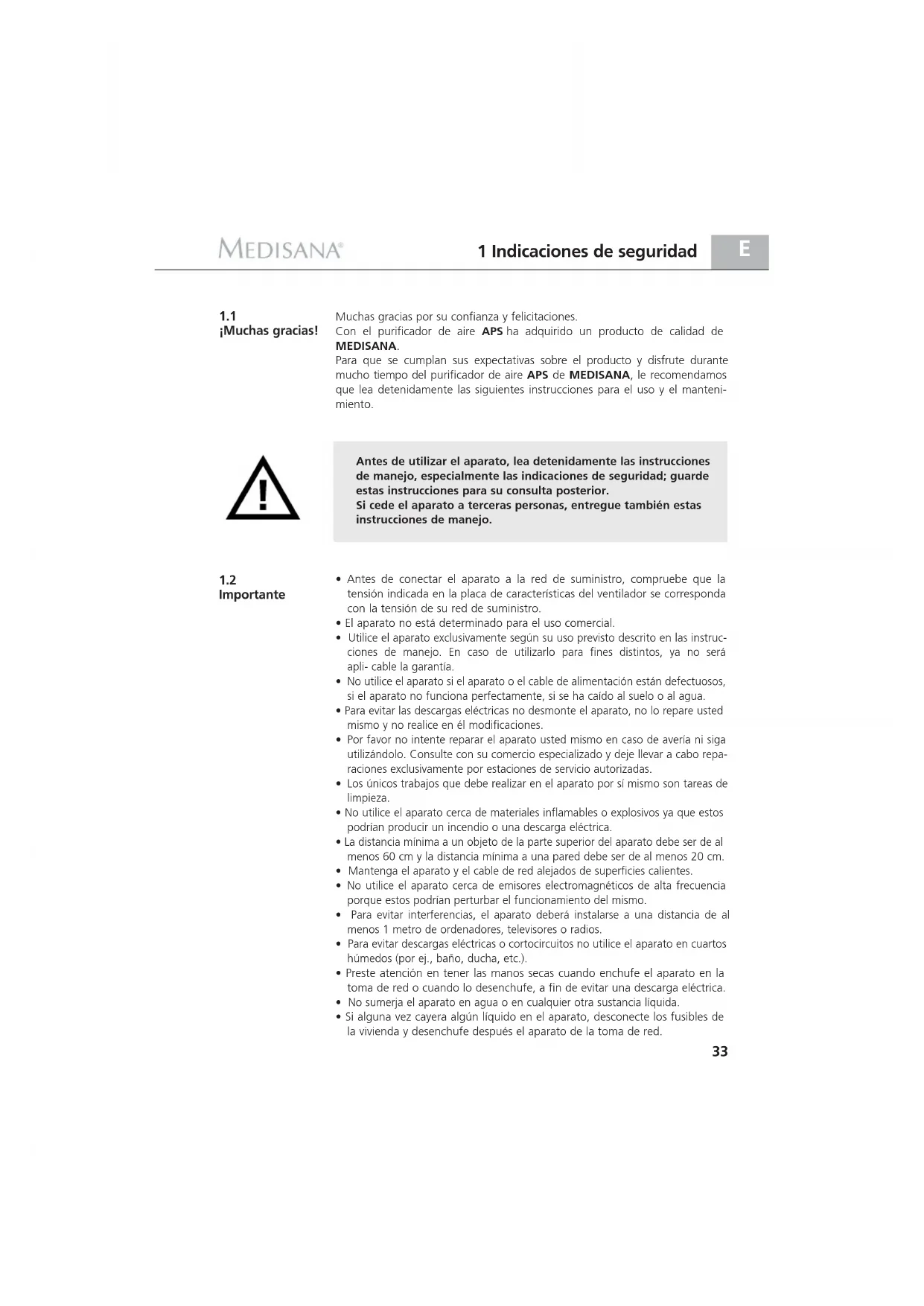 Importante Muchas gracias por su confianza y felicitaciones. Con el purificador de aire APS ha adquirido un producto de calidad de MEDISANA. Para que se cumplan sus expectativas sobre el producto y disfrute durante mucho tiempo del purificador de aire APS de MEDISANA, le recomendamos que lea detenidamente las siguientes instrucciones para el uso y el manteni- miento. Antes de utilizar el aparato, lea detenidamente las instrucciones de manejo, especialmente las indicaciones de seguridad; guarde estas instrucciones para su consulta posterior. Si cede el aparato a terceras personas, entregue también estas instrucciones de manejo.