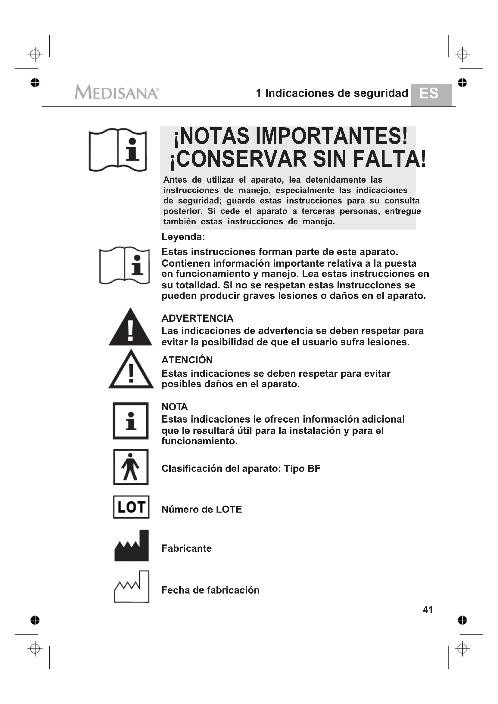 Leyenda: Número de LOTE Fecha de fabricación Clasificación del aparato: Tipo BF ¡NOTAS IMPORTANTES! ¡CONSERVAR SIN FALTA! Estas instrucciones forman parte de este aparato. Contienen información importante relativa a la puesta en funcionamiento y manejo. Lea estas instrucciones en su totalidad. Si no se respetan estas instrucciones se pueden producir graves lesiones o daños en el aparato. ADVERTENCIA Las indicaciones de advertencia se deben respetar para evitar la posibilidad de que el usuario sufra lesiones. ATENCIÓN Estas indicaciones se deben respetar para evitar posibles daños en el aparato. NOTA Estas indicaciones le ofrecen información adicional que le resultará útil para la instalación y para el funcionamiento. Fabricante Antes de utilizar el aparato, lea detenidamente las instrucciones de manejo, especialmente las indicaciones de seguridad; guarde estas instrucciones para su consulta posterior. Si cede el aparato a terceras personas, entregue también estas instrucciones de manejo.1 Indicaciones de seguridad