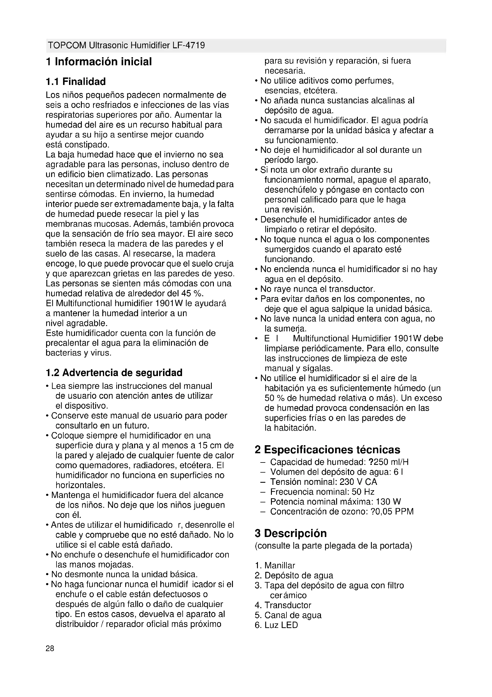 abitación ya es suficientemente húmedo (un 50 % de humedad relativa o más). Un exceso de humedad provoca condensación en las superficies frías o en las paredes de la habitación. 2 Especificaciones técnicas – Capacidad de humedad: ?250 ml/H – Volumen del depósito de agua: 6 l – Tensión nominal: 230 V CA – Frecuencia nominal: 50 Hz – Potencia nominal máxima: 130 W – Concentración de ozono: ?0,05 PPM 3 Descripción (consulte la parte plegada de la portada)