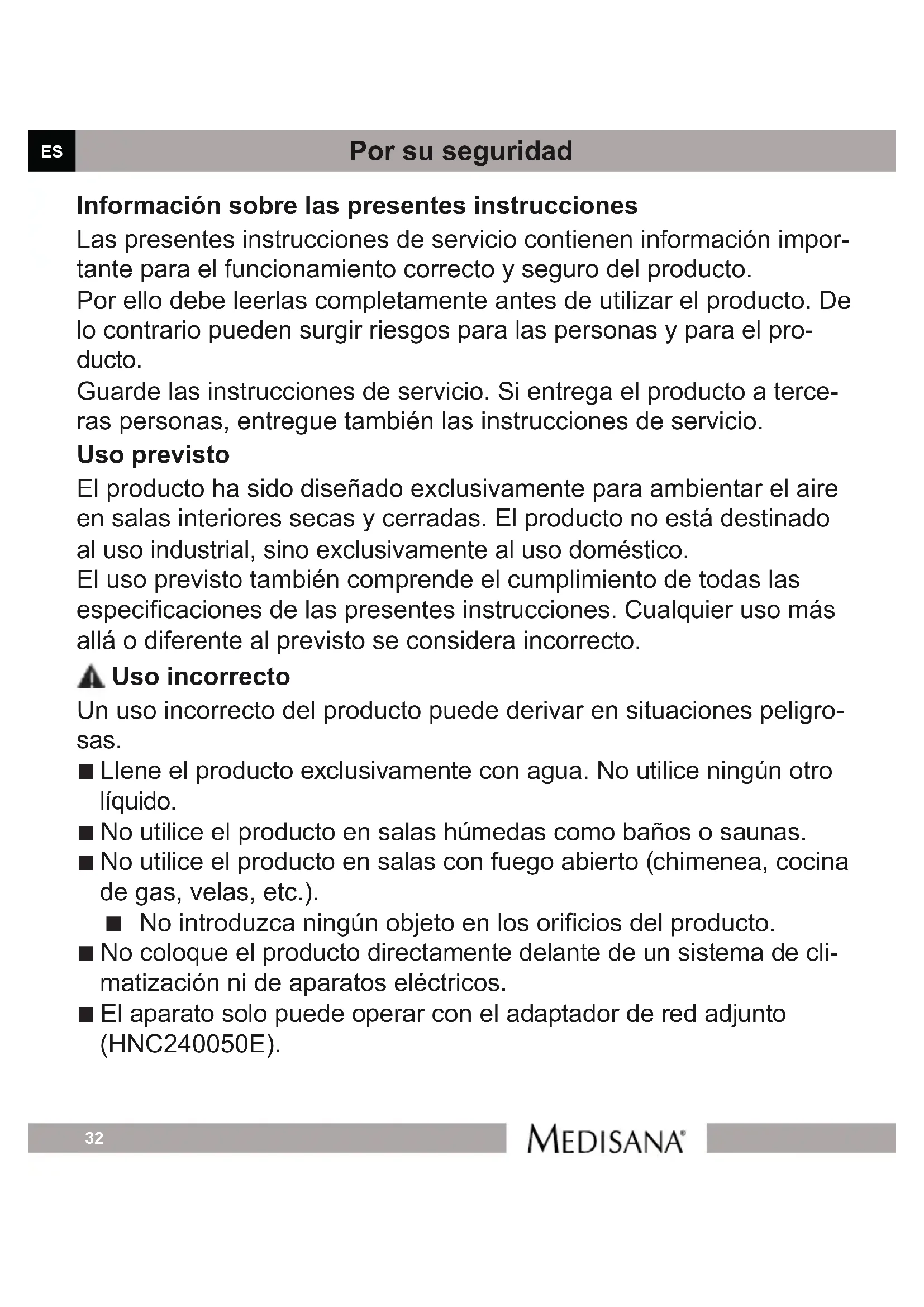 Por su seguridad Información sobre las presentes instrucciones Las presentes instrucciones de servicio contienen información impor- tante para el funcionamiento correcto y seguro del producto. Por ello debe leerlas completamente antes de utilizar el producto. De lo contrario pueden surgir riesgos para las personas y para el pro- ducto. Guarde las instrucciones de servicio. Si entrega el producto a terce- ras personas, entregue también las instrucciones de servicio. Uso previsto El producto ha sido diseñado exclusivamente para ambientar el aire en salas interiores secas y cerradas. El producto no está destinado al uso industrial, sino exclusivamente al uso doméstico. El uso previsto también comprende el cumplimiento de todas las especicaciones de las presentes instrucciones. Cualquier uso más allá o diferente al previsto se considera incorrecto. Uso incorrecto Un uso incorrecto del producto puede derivar en situaciones peligro- sas. ■ Llene el producto exclusivamente con agua. No utilice ningún otro líquido. ■ No utilice el producto en salas húmedas como baños o saunas. ■ No utilice el producto en salas con fuego abierto (chimenea, cocina de gas, velas, etc.). ■ No introduzca ningún objeto en los oricios del producto. ■ No coloque el producto directamente delante de un sistema de cli- matización ni de aparatos eléctricos. ■ El aparato solo puede operar con el adaptador de red adjunto
