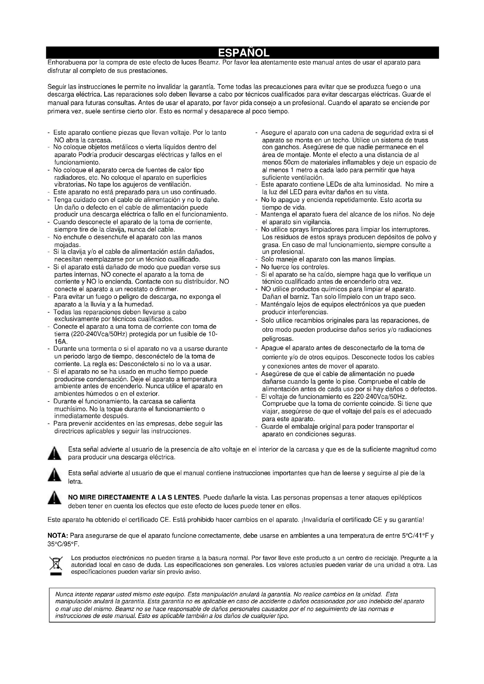 - Änderungen, ohne dass Sie den vom Hersteller geändert informieren. ACHTUNG: Wartungs- und Servicearbeiten sind ausschließlich dem autorisierten Fachhandel vorbehalten!ESPAÑOL Enhorabuena por la compra de este efecto de luces Beamz. Por favor lea atentamente este manual antes de usar el aparato para disfrutar al completo de sus prestaciones. Seguir las instrucciones le permite no invalidar la garantía. Tome todas las precauciones para evitar que se produzca fuego o una descarga eléctrica. Las reparaciones solo deben llevarse a cabo por técnicos cualificados para evitar descargas eléctricas. Guarde el manual para futuras consultas. Antes de usar el aparato, por favor pida consejo a un profesional. Cuando el aparato se enciende por primera vez, suele sentirse cierto olor. Esto es normal y desaparece al poco tiempo. - Este aparato contiene piezas que llevan voltaje. Por lo tanto NO abra la carcasa. - No coloque objetos metálicos o vierta líquidos dentro del aparato Podría producir descargas eléctricas y fallos en el funcionamiento. - No coloque el aparato cerca de fuentes de calor tipo radiadores, etc. No coloque el aparato en superficies vibratorias. No tape los agujeros de ventilación. - Este aparato no está preparado para un uso continuado. - Tenga cuidado con el cable de alimentación y no lo dañe. Un daño o defecto en el cable de alimentación puede producir una descarga eléctrica o fallo en el funcionamiento. - Cuando desconecte el aparato de la toma de corriente, siempre tire de la clavija, nunca del cable. - No enchufe o desenchufe el aparato con las manos mojadas. - Si la clavija y/o el cable de alimentación están dañados, necesitan reemplazarse por un técnico cualificado. - Si el aparato está dañado de modo que puedan verse sus partes internas, NO conecte el aparato a la toma de corriente y NO lo encienda. Contacte con su distribuidor. NO conecte el aparato a un reostato o dimmer. - Para evitar un fuego o peligro de descarga, no exponga el aparato a la lluvia y a la humedad. - Todas las reparaciones deben llevarse a cabo exclusivamente por técnicos cualificados. - Conecte el aparato a una toma de corriente con toma de tierra (220-240Vca/50Hz) protegida por un fusible de 10- 16A. - Durante una tormenta o si el aparato no va a usarse durante un periodo largo de tiempo, desconéctelo de la toma de corriente. La regla es: Desconéctelo si no lo va a usar. - Si el aparato no se ha usado en mucho tiempo puede producirse condensación. Deje el aparato a temperatura ambiente antes de encenderlo. Nunca utilice el aparato en ambientes húmedos o en el exterior. - Durante el funcionamiento, la carcasa se calienta muchísimo. No la toque durante el funcionamiento o inmediatamente después. - Para prevenir accidentes en las empresas, debe seguir las directrices aplicables y seguir las instrucciones. - Asegure el aparato con una cadena de seguridad extra si el aparato se monta en un techo. Utilice un sistema de truss con ganchos. Asegúrese de que nadie permanece en el área de montaje. Monte el efecto a una distancia de al menos 50cm de materiales inflamables y deje un espacio de al menos 1 metro a cada lado para permitir que haya suficiente ventilación. - Este aparato contiene LEDs de alta luminosidad. No mire a la luz del LED para evitar daños en su vista. - No lo apague y encienda repetidamente. Esto acorta su tiempo de vida. - Mantenga el aparato fuera del alcance de los niños. No deje el aparato sin vigilancia. - No utilice sprays limpiadores para limpiar los interruptores. Los residuos de estos sprays producen depósitos de polvo y grasa. En caso de mal funcionamiento, siempre consulte a un profesional. - Solo maneje el aparato con las manos limpias. - No fuerce los controles. - Si el aparato se ha caído, siempre haga que lo verifique un técnico cualificado antes de encenderlo otra vez. - NO utilice productos químicos para limpiar el aparato. Dañan el barniz. Tan solo límpielo con un trapo seco. - Manténgalo lejos de equipos electrónicos ya que pueden producir interferencias. - Solo utilice recambios originales para las reparaciones, de otro modo pueden producirse daños serios y/o radiaciones peligrosas. - Apague el aparato antes de desconectarlo de la toma de corriente y/o de otros equipos. Desconecte todos los cables y conexiones antes de mover el aparato. - Asegúrese de que el cable de alimentación no puede dañarse cuando la gente lo pise. Compruebe el cable de alimentación antes de cada uso por si hay daños o defectos. - El voltaje de funcionamiento es 220-240Vca/50Hz. Compruebe que la toma de corriente coincide. Si tiene que viajar, asegúrese de que el voltaje del país es el adecuado para este aparato. - Guarde el embalaje original para poder transportar el aparato en condiciones seguras. Esta señal advierte al usuario de la presencia de alto voltaje en el interior de la carcasa y que es de la suficiente magnitud como para producir una descarga eléctrica. Esta señal advierte al usuario de que el manual contiene instrucciones importantes que han de leerse y seguirse al pie de la letra. NO MIRE DIRECTAMENTE A LA S LENTES. Puede dañarle la vista. Las personas propensas a tener ataques epilépticos deben tener en cuenta los efectos que este efecto de luces puede tener en ellos. Este aparato ha obtenido el certificado CE. Está prohibido hacer cambios en el aparato. ¡Invalidaría el certificado CE y su garantía! NOTA: Para asegurarse de que el aparato funcione correctamente, debe usarse en ambientes a una temperatura de entre 5°C/41°F y 35°C/95°F. Los productos electrónicos no pueden tirarse a la basura normal. Por favor lleve este producto a un centro de reciclaje. Pregunte a la autoridad local en caso de duda. Las especificaciones son generales. Los valores actuales pueden variar de una unidad a otra. Las especificaciones pueden variar sin previo aviso.