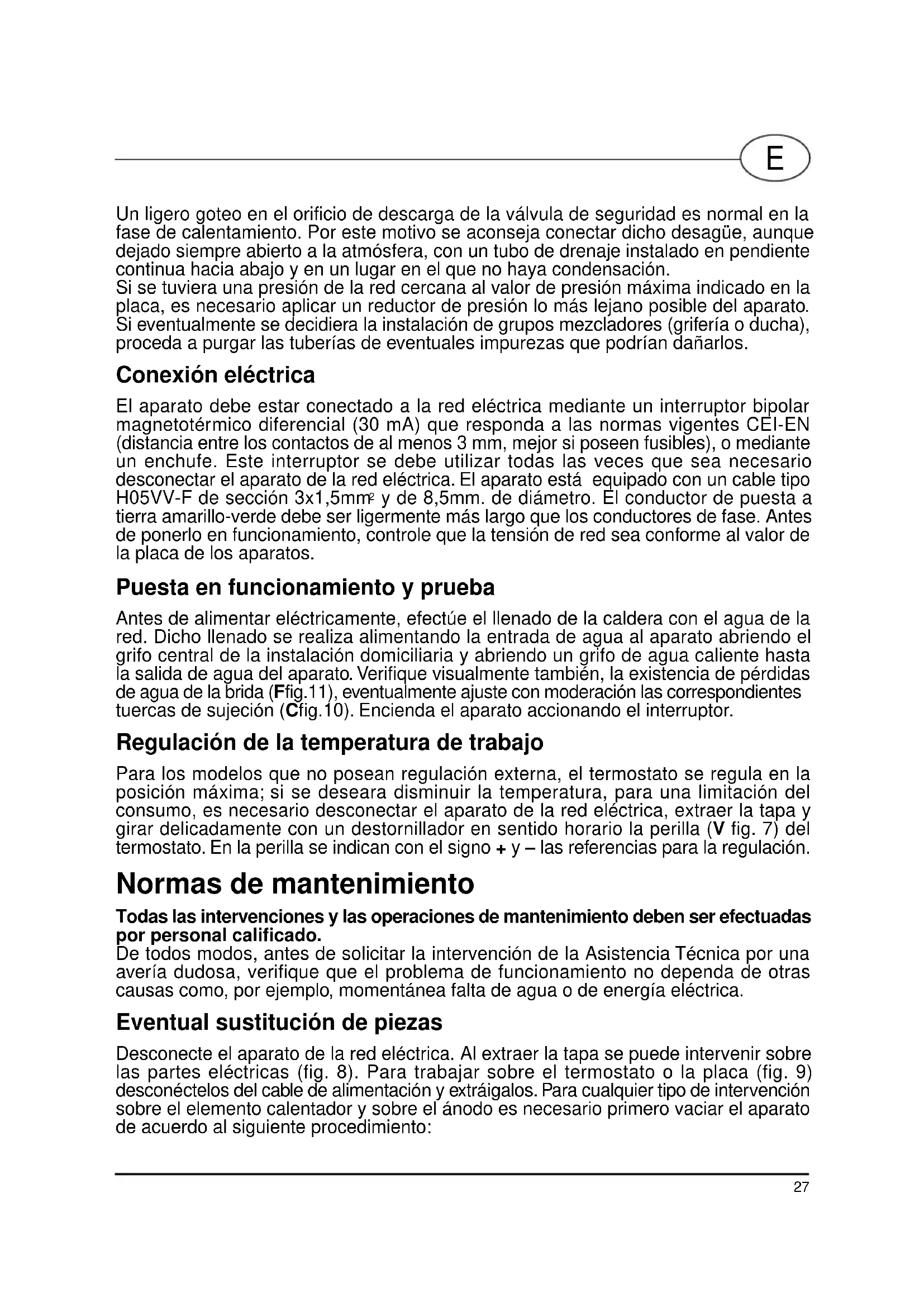 !27 Un ligero goteo en el orificio de descarga de la válvula de seguridad es normal en la fase de calentamiento. Por este motivo se aconseja conectar dicho desagüe, aunque dejado siempre abierto a la atmósfera, con un tubo de drenaje instalado en pendiente continua hacia abajo y en un lugar en el que no haya condensación. Si se tuviera una presión de la red cercana al valor de presión máxima indicado en la placa, es necesario aplicar un reductor de presión lo más lejano posible del aparato. Si eventualmente se decidiera la instalación de grupos mezcladores (grifería o ducha), proceda a purgar las tuberías de eventuales impurezas que podrían dañarlos. Conexión eléctrica El aparato debe estar conectado a la red eléctrica mediante un interruptor bipolar magnetotérmico diferencial (30 mA) que responda a las normas vigentes CEI-EN (distancia entre los contactos de al menos 3 mm, mejor si poseen fusibles), o mediante un enchufe. Este interruptor se debe utilizar todas las veces que sea necesario desconectar el aparato de la red eléctrica. El aparato está equipado con un cable tipo H05VV-F de sección 3x1,5mm y de 8,5mm. de diámetro. El conductor de puesta a tierra amarillo-verde debe ser ligermente más largo que los conductores de fase. Antes de ponerlo en funcionamiento, controle que la tensión de red sea conforme al valor de la placa de los aparatos. Puesta en funcionamiento y prueba Antes de alimentar eléctricamente, efectúe el llenado de la caldera con el agua de la red. Dicho llenado se realiza alimentando la entrada de agua al aparato abriendo el grifo central de la instalación domiciliaria y abriendo un grifo de agua caliente hasta la salida de agua del aparato. Verifique visualmente también, la existencia de pérdidas de agua de la brida (Ffig.11), eventualmente ajuste con moderación las correspondientes tuercas de sujeción (Cfig.10). Encienda el aparato accionando el interruptor. Regulación de la temperatura de trabajo Para los modelos que no posean regulación externa, el termostato se regula en la posición máxima; si se deseara disminuir la temperatura, para una limitación del consumo, es necesario desconectar el aparato de la red eléctrica, extraer la tapa y girar delicadamente con un destornillador en sentido horario la perilla (V fig. 7) del termostato. En la perilla se indican con el signo + y – las referencias para la regulación. Normas de mantenimiento Todas las intervenciones y las operaciones de mantenimiento deben ser efectuadas por personal calificado. De todos modos, antes de solicitar la intervención de la Asistencia Técnica por una avería dudosa, verifique que el problema de funcionamiento no dependa de otras causas como, por ejemplo, momentánea falta de agua o de energía eléctrica. Eventual sustitución de piezas Desconecte el aparato de la red eléctrica. Al extraer la tapa se puede intervenir sobre las partes eléctricas (fig. 8). Para trabajar sobre el termostato o la placa (fig. 9) desconéctelos del cable de alimentación y extráigalos. Para cualquier tipo de intervención sobre el elemento calentador y sobre el ánodo es necesario primero vaciar el aparato de acuerdo al siguiente procedimiento: