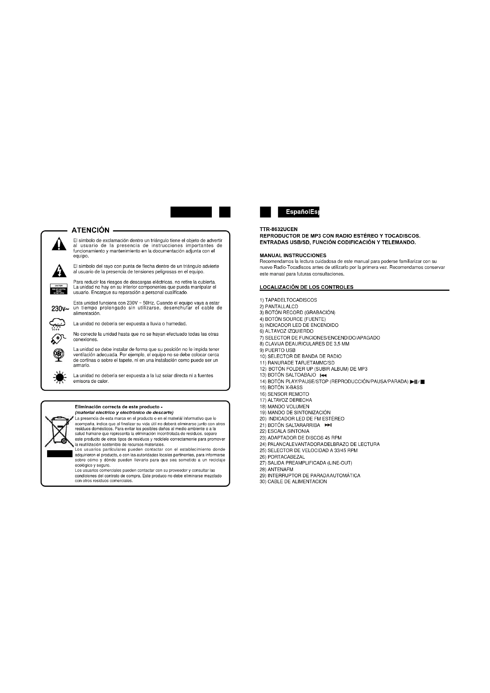El símbolo de exclamación dentro un triángulo tiene el objeto de advertir al usuario de la presencia de instrucciones importantes de funcionamiento y mantenimiento en la documentación adjunta con el equipo. El símbolo del rayo con punta de flecha dentro de un triángulo advierte al usuario de la presencia de tensiones peligrosas en el equipo. Para reducir los riesgos de descargas eléctricas, no retire la cubierta. La unidad no hay en su interior componentes que pueda manipular el usuario. Encargue su reparación a personal cualificado. Esta unidad funciona con 230V ~ 50Hz. Cuando el equipo vaya a estar un tiempo prolongado sin utilizarse, desenchufar el cable de alimentación. La unidad no debería ser expuesta a lluvia o humedad. No conecte la unidad hasta que no se hayan efectuado todas las otras conexiones. La unidad se debe instalar de forma que su posición no le impida tener ventilación adecuada. Por ejemplo, el equipo no se debe colocar cerca de cortinas o sobre el tapete, ni en una instalación como puede ser un armario. La unidad no debería ser expuesta a la luz solar directa ni a fuentes emisora de calor. ATENCIÓN Eliminación correcta de este producto - (material electrico y electrónico de descarte) La presencia de esta marca en el producto o en el materiál informativo que lo acompaña, indica que al finalizar su vida útil no deberá eliminarse junto con otros residuos domésticos. Para evitar los posibles daños al medio ambiente o a la salud humane que representa la eliminación incontrolada de residuos, separe este producto de otros tipos de residuos y reciclelo correctamente para promover la reutilización sostenible de recursos materiales. Los usuarios particulares pueden contactar con el establecimiento donde adquirieron el producto, o con las autoridades locales pertinentes, para informarse sobre cómo y dónde pueden lIevario para que sea sometido a un reciclaje ecológico y seguro. Los usuarios comerciales pueden contactar con su proveedor y consultar las condiciones del contrato de compra. Este produco no debe eliminarse mezclado con otros residuos comerciales.EspañolEspañol 43 44 MANDOADISTANCIA