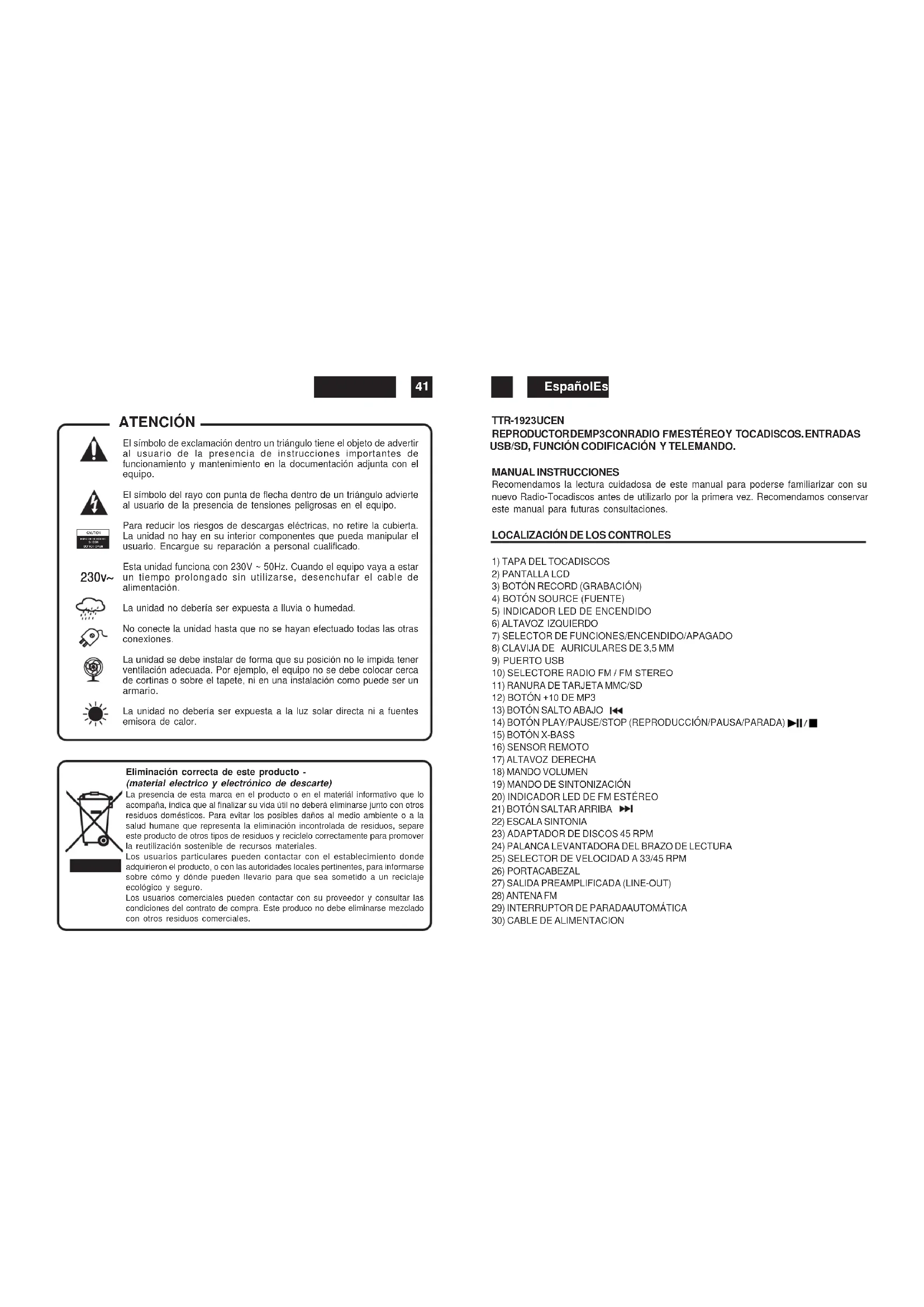 El símbolo de exclamación dentro un triángulo tiene el objeto de advertir al usuario de la presencia de instrucciones importantes de funcionamiento y mantenimiento en la documentación adjunta con el equipo. El símbolo del rayo con punta de flecha dentro de un triángulo advierte al usuario de la presencia de tensiones peligrosas en el equipo. Para reducir los riesgos de descargas eléctricas, no retire la cubierta. La unidad no hay en su interior componentes que pueda manipular el usuario. Encargue su reparación a personal cualificado. Esta unidad funciona con 230V ~ 50Hz. Cuando el equipo vaya a estar un tiempo prolongado sin utilizarse, desenchufar el cable de alimentación. La unidad no debería ser expuesta a lluvia o humedad. No conecte la unidad hasta que no se hayan efectuado todas las otras conexiones. La unidad se debe instalar de forma que su posición no le impida tener ventilación adecuada. Por ejemplo, el equipo no se debe colocar cerca de cortinas o sobre el tapete, ni en una instalación como puede ser un armario. La unidad no debería ser expuesta a la luz solar directa ni a fuentes emisora de calor. 230v~ ATENCIÓN Eliminación correcta de este producto - (material electrico y electrónico de descarte) La presencia de esta marca en el producto o en el materiál informativo que loacompaña, indica que al finalizar su vida útil no deberá eliminarse junto con otrosresiduos domésticos. Para evitar los posibles daños al medio ambiente o a lasalud humane que representa la eliminación incontrolada de residuos, separeeste producto de otros tipos de residuos y reciclelo correctamente para promoverla reutilización sostenible de recursos materiales.Los usuarios particulares pueden contactar con el establecimiento dondeadquirieron el producto, o con las autoridades locales pertinentes, para informarsesobre cómo y dónde pueden lIevario para que sea sometido a un reciclajeecológico y seguro.Los usuarios comerciales pueden contactar con su proveedor y consultar lascondiciones del contrato de compra. Este produco no debe eliminarse mezcladocon otros residuos comerciales. TTR-1923UCEN REPRODUCTOR DE MP3 CON RADIO FM ESTÉREO Y TOCADISCOS.ENTRADAS USB/SD, FUNCIÓN CODIFICACIÓN Y TELEMANDO.
