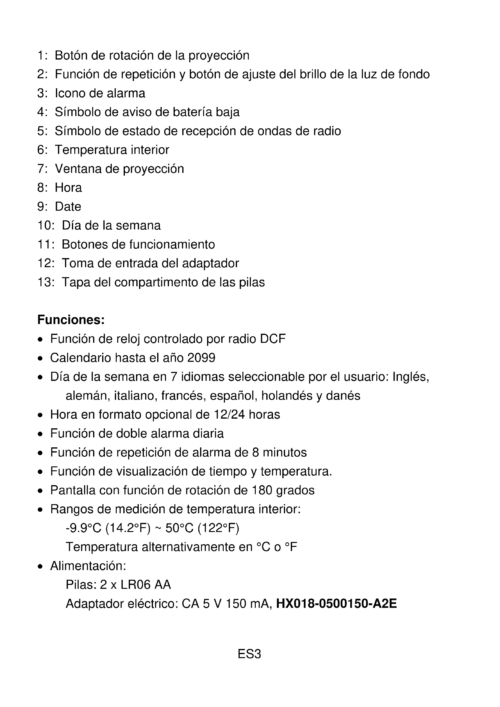 - Adaptador electrico: CA 5 V 150 mA, HX018-0500150-A2E