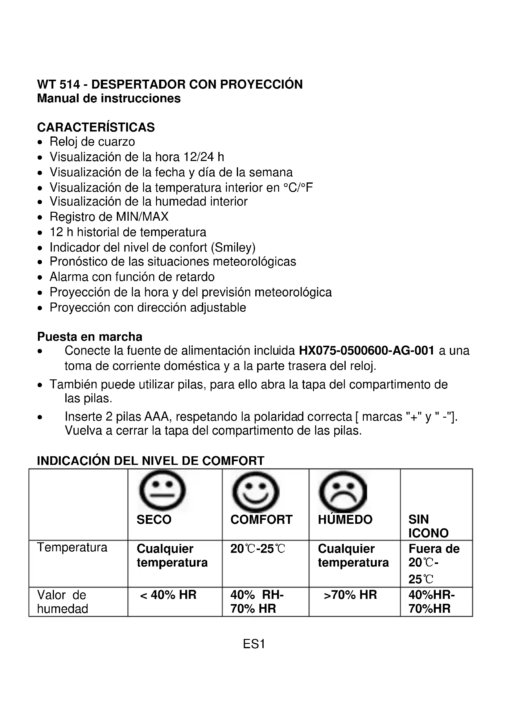 Manual de instrucciones CARACTERÍSTICAS Reloj de cuarzo Visualización de la hora 12/24 h Visualización de la fecha y día de la semana Visualización de la temperatura interior en °C/°F Visualización de la humedad interior Registro de MIN/MAX 12 h historial de temperatura Indicador del nivel de confort (Smiley) Pronóstico de las situaciones meteorológicas Alarma con función de retardo Proyección de la hora y del previsión meteorológica Proyección con dirección adjustable Puesta en marcha Conecte la fuente de alimentación incluida HX075-0500600-AG-001 a una toma de corriente doméstica y a la parte trasera del reloj. También puede utilizar pilas, para ello abra la tapa del compartimento de las pilas. Inserte 2 pilas AAA, respetando la polaridad correcta [ marcas "+" y " -"]. Vuelva a cerrar la tapa del compartimento de las pilas.