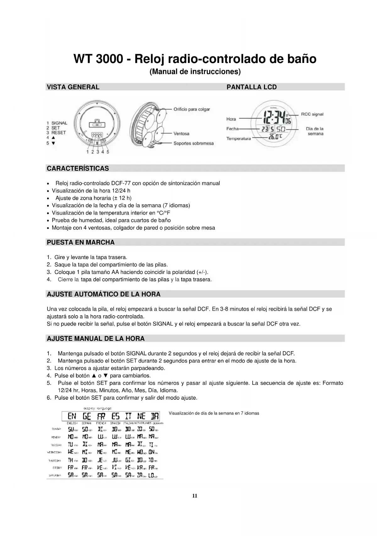 • Ajuste de zona horaria (± 12 h) - Visualización de la fecha y día de la semana (7 idiomas)