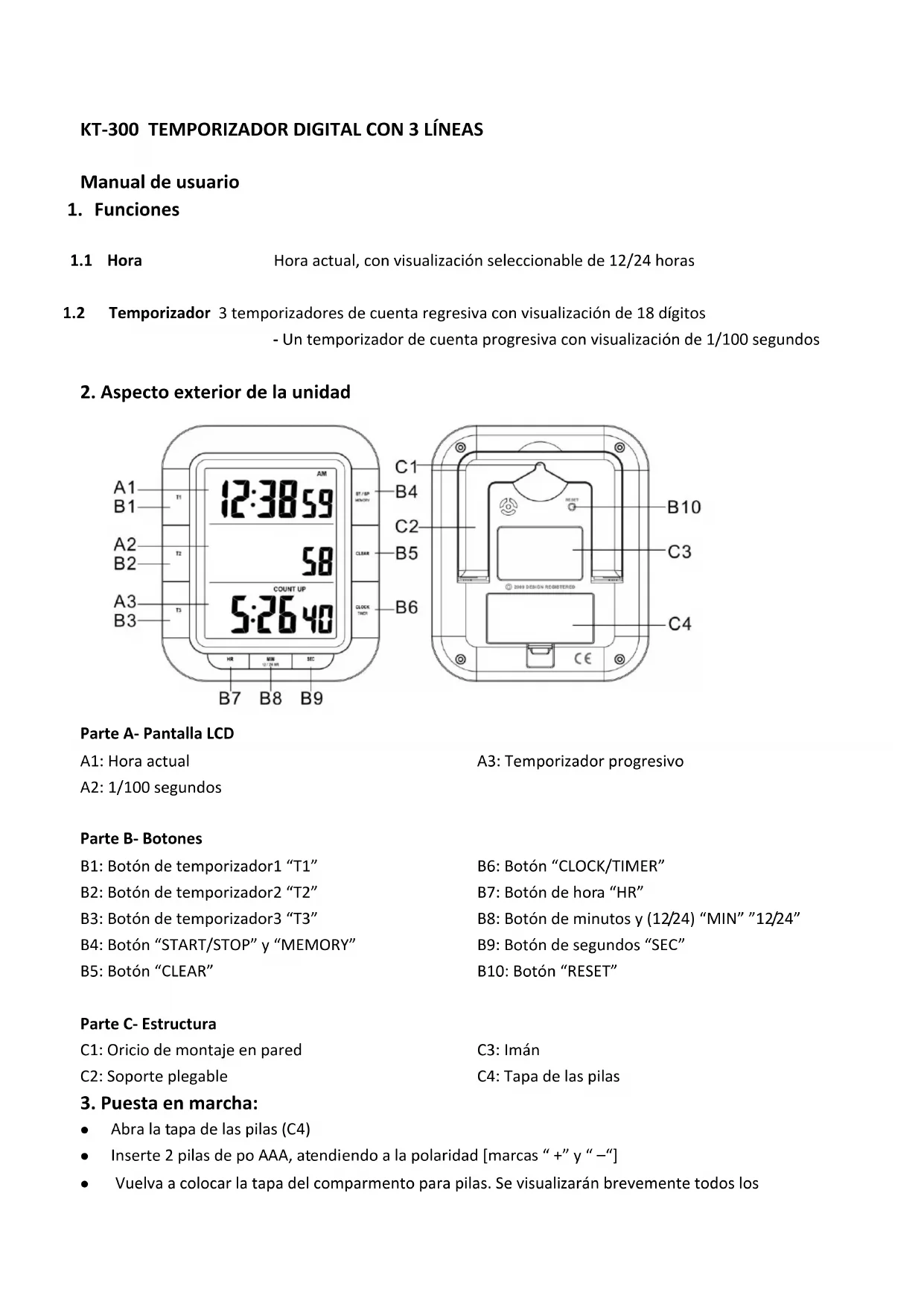 Parte B- Botones B1: Botón de temporizador1 “T1” B2: Botón de temporizador2 “T2” B3: Botón de temporizador3 “T3” B4: Botón “START/STOP” y “MEMORY” B5: Botón “CLEAR” B6: Botón “CLOCK/TIMER” B7: Botón de hora “HR” B8: Botón de minutos y (12/24) “MIN” ”12/24” B9: Botón de segundos “SEC” B10: Botón “RESET” Parte C- Estructura C1: Orificio de montaje en pared C2: Soporte plegable C3: Imán C4: Tapa de las pilas