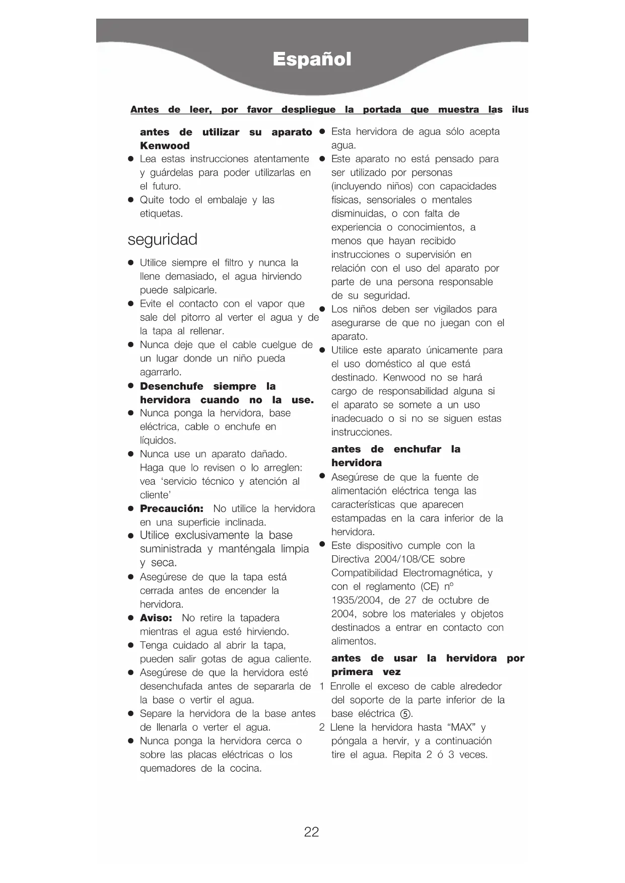 Utilice este aparato únicamente para el uso doméstico al que está destinado. Kenwood no se hará cargo de responsabilidad alguna si el aparato se somete a un uso inadecuado o si no se siguen estas instrucciones. antes de enchufar la hervidora