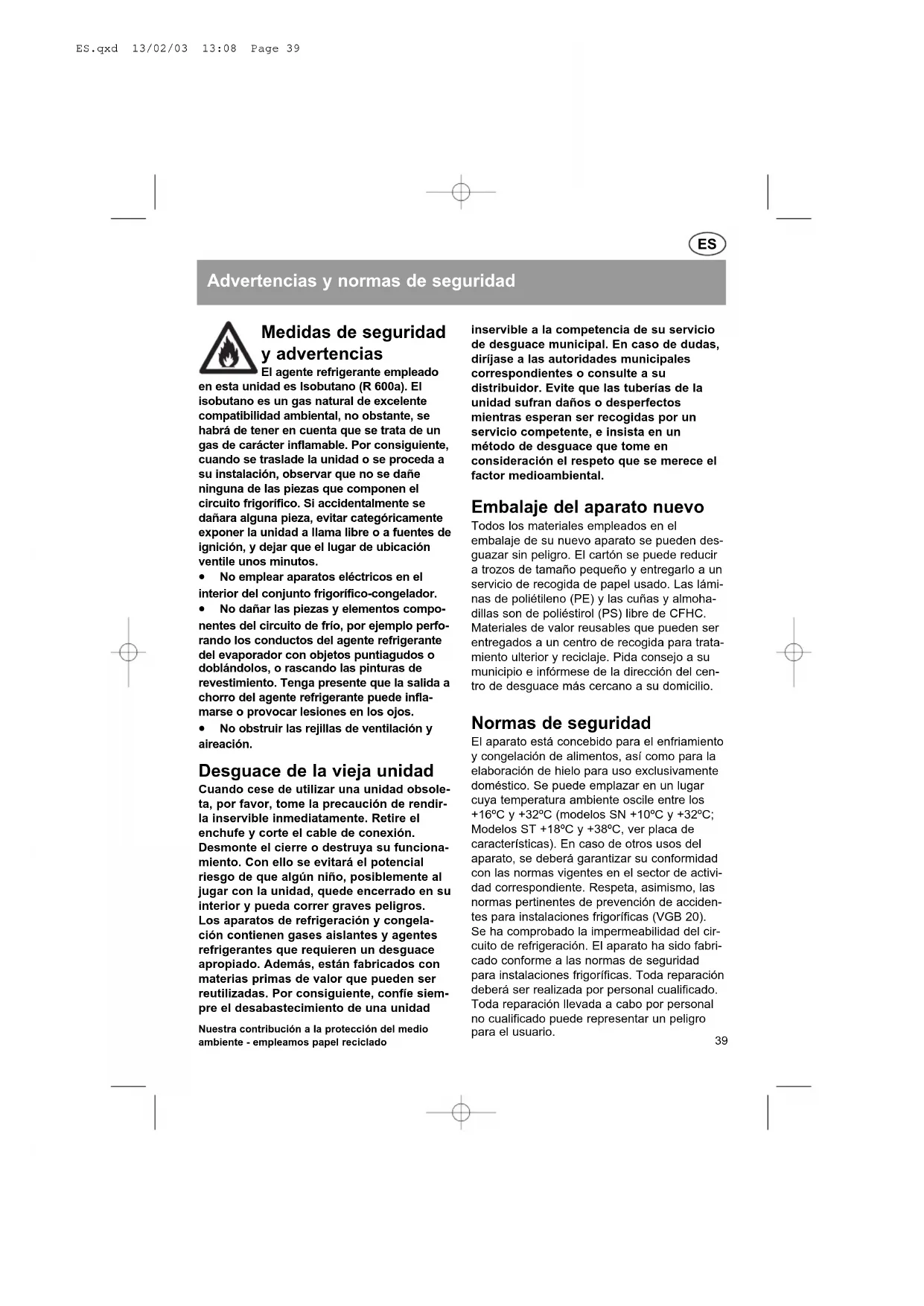 FR.qxd 13/02/03 13:08 Page 25ES.qxd 13/02/03 13:08 Page 38Advertencias y normas de seguridad Medidas de seguridad y advertencias El agente refrigerante empleado en esta unidad es Isobutano (R 600a). El isobutano es un gas natural de excelente compatibilidad ambiental, no obstante, se habrá de tener en cuenta que se trata de un gas de carácter inflamable. Por consiguiente, cuando se traslade la unidad o se proceda a su instalación, observar que no se dañe ninguna de las piezas que componen el circuito frigorífico. Si accidentalmente se dañara alguna pieza, evitar categóricamente exponer la unidad a llama libre o a fuentes de ignición, y dejar que el lugar de ubicación ventile unos minutos.