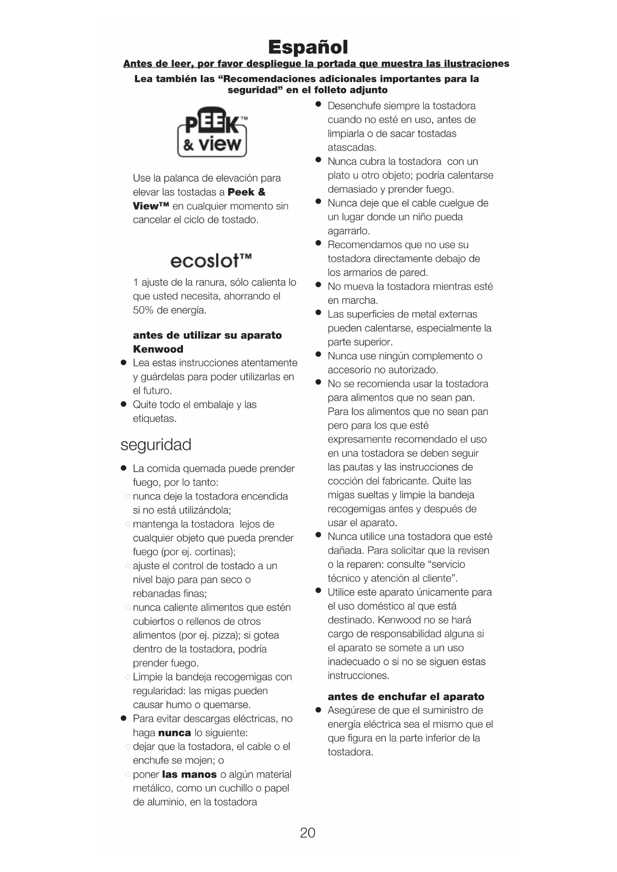2002/96/CE. Al final de su vida útil, el producto no debe eliminarse junto a los desechos urbanos. Puede entregarse a centros específicos de recogida diferenciada dispuestos por las administraciones municipales, o a distribuidores que faciliten este servicio. Eliminar por separado un electrodoméstico significa evitar posibles consecuencias negativas para el medio ambiente y la salud derivadas de una eliminación inadecuada, y permite reciclar los materiales que lo componen, obteniendo así un ahorro importante de energía y recursos. Para subrayar la obligación de eliminar por separado los electrodomésticos, en el producto aparece un contenedor de basura móvil tachado. 22Brug håndtaget til at løfte brødet til Peek & View™ på et hvilket som helst tidspunkt uden af annullere brødristningen. 1 pladsindstilling, opvarmer kun hvad du har behov for, sparer 50 % energi. før Kenwood-apparatet tages i brug