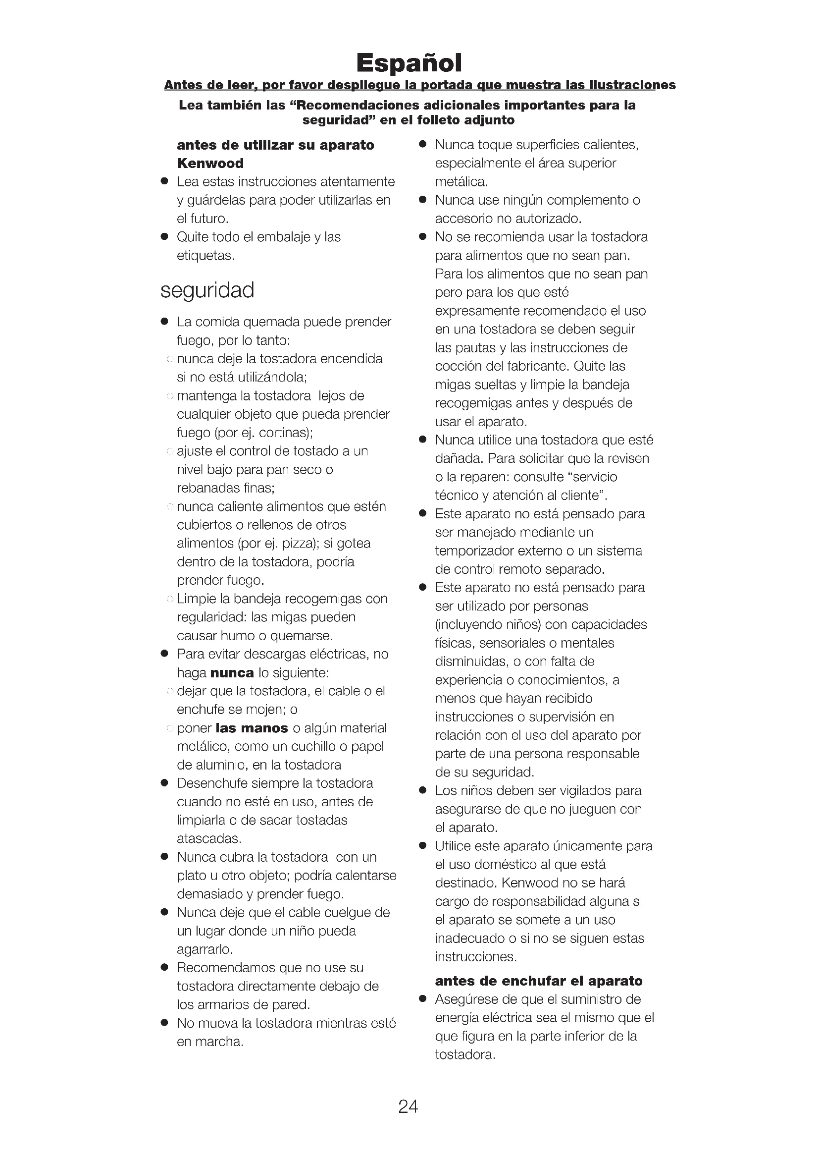 Utilice este aparato únicamente para el uso doméstico al que está destinado. Kenwood no se hará cargo de responsabilidad alguna si el aparato se somete a un uso inadecuado o si no se siguen estas instrucciones. antes de enchufar el aparato
