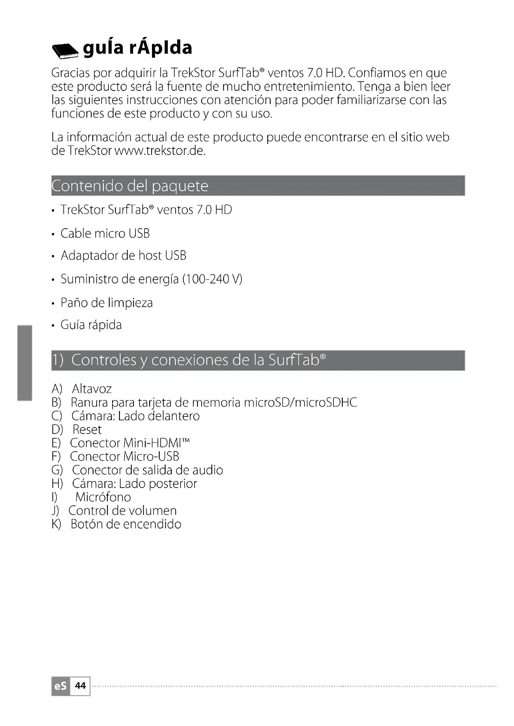 guía rápIda Gracias por adquirir la TrekStor SurfTab® ventos 7.0 HD. Confiamos en que este producto será la fuente de mucho entretenimiento. Tenga a bien leer las siguientes instrucciones con atención para poder familiarizarse con las funciones de este producto y con su uso. La información actual de este producto puede encontrarse en el sitio web de TrekStor www.trekstor.de. Contenido del paquete