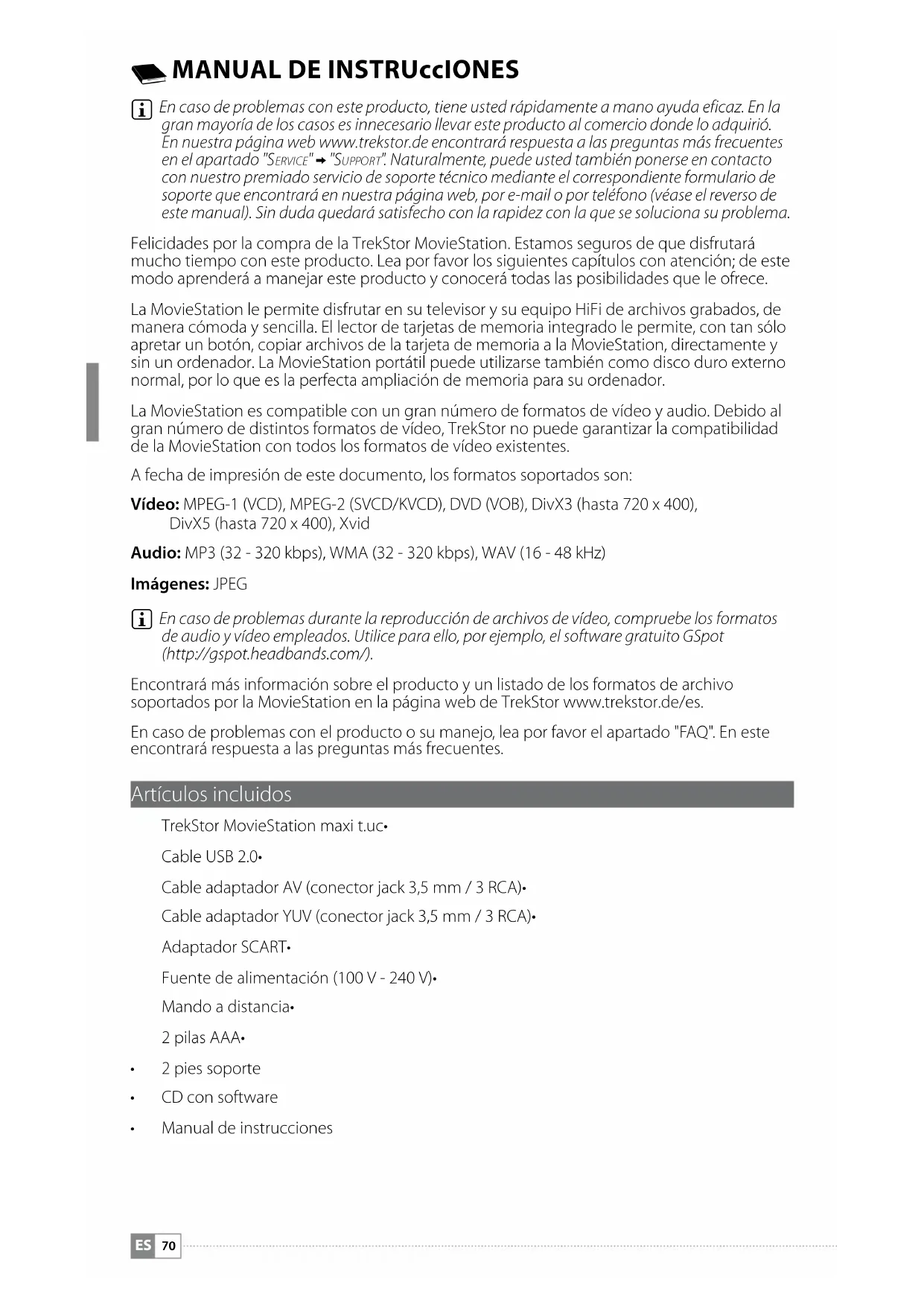En caso de problemas durante la reproducción de archivos de vídeo, compruebe los formatos de audio y vídeo empleados. Utilice para ello, por ejemplo, el software gratuito GSpot (http://gspot.headbands.com/). Encontrará más información sobre el producto y un listado de los formatos de archivo soportados por la MovieStation en la página web de TrekStor www.trekstor.de/es. En caso de problemas con el producto o su manejo, lea por favor el apartado "FAQ". En este encontrará respuesta a las preguntas más frecuentes. Artículos incluidos TrekStor MovieStation maxi t.uc• Cable USB 2.0• Cable adaptador AV (conector jack 3,5 mm / 3 RCA)• Cable adaptador YUV (conector jack 3,5 mm / 3 RCA)• Adaptador SCART• Fuente de alimentación (100 V - 240 V)• Mando a distancia• 2 pilas AAA• 2 pies soporte• CD con software• Manual de instrucciones•ES